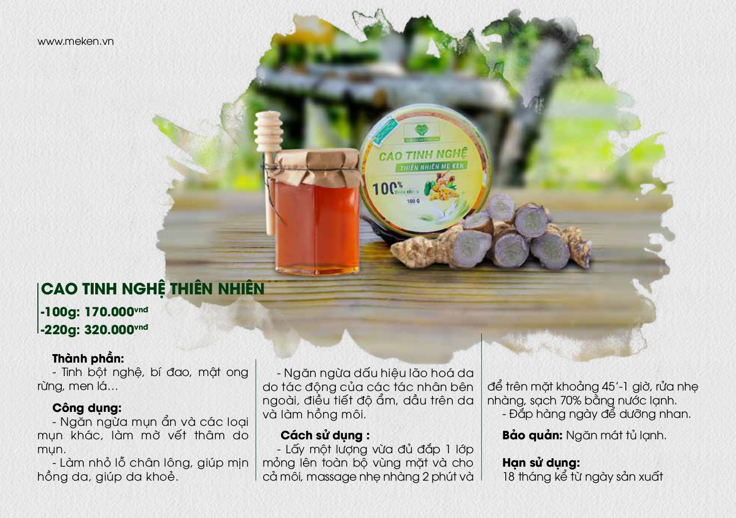 CAO TINH NGHỆ THIÊN NHIÊN MẸ KEN - THÀNH PHẦN:- Tinh bột nghệ, bí đao, mật ong rừng, men lá… - CÔNG DỤNG: * Ngăn ngừa mụn ẩn và các loại mụn khác, làm mờ