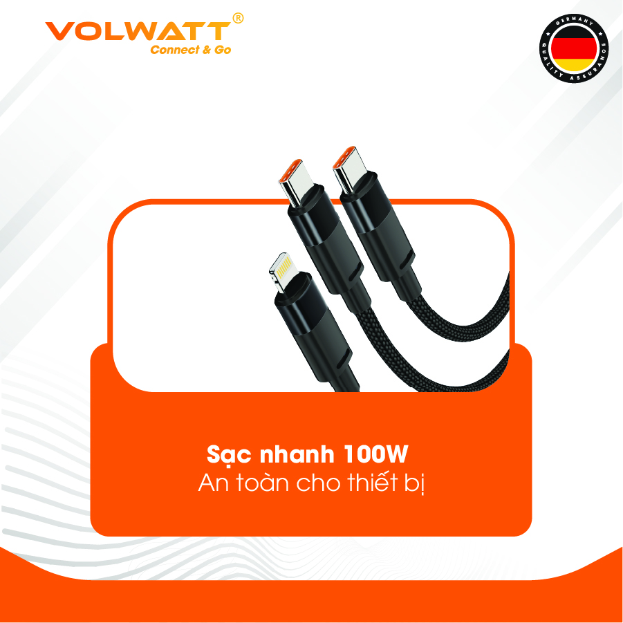 ✨Cáp sạc siêu nhanh 3 đầu Volwatt GE-S36-S3 hàng chính hãng | Type-C ra C (100W)+C(15W)+L(27W), dây bện 1.5m | BH 12 tháng