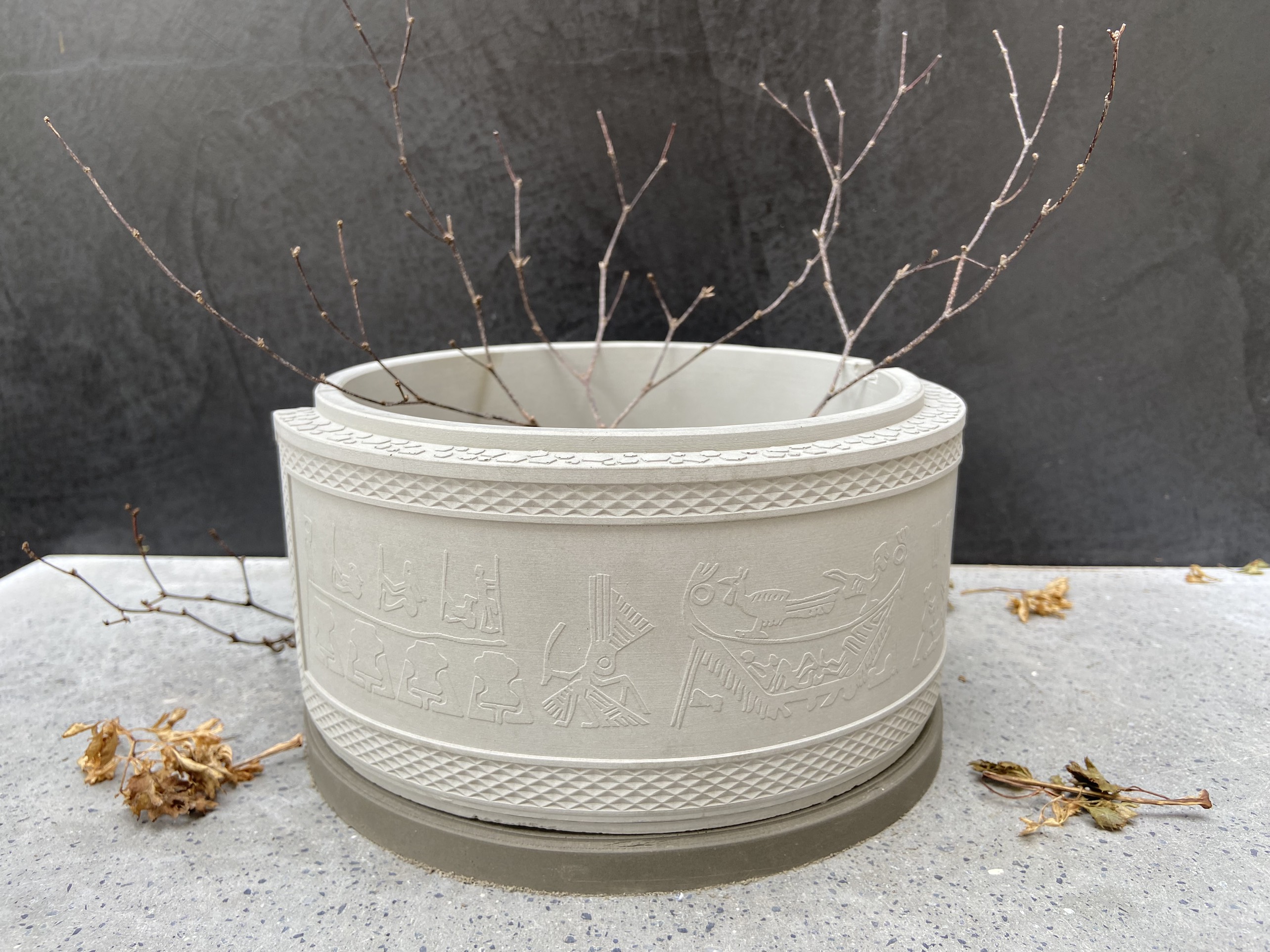 Chậu cây xi măng bậc thang với trang trí hoạ tiết Trống Đồng Đông Sơn, đường kính 18.4cm cao 8,5 cm, Hàng thủ công mỹ nghệ, quà tặng cao cấp, decor bàn làm việc, cây văn phòng, nhà ở