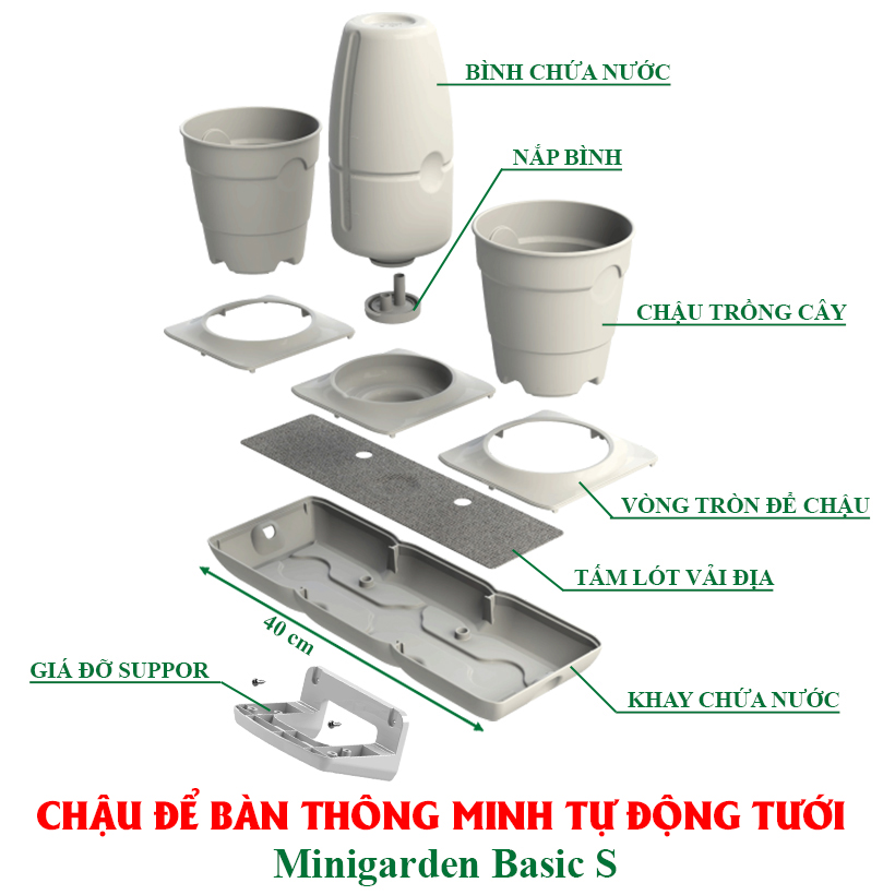 LẮP ĐẶT CHẬU TRỒNG CÂY ĐỂ BÀN THÔNG MINH TỰ TƯỚI CAO CẤP MINIGARDEN BASIC POTS S NHƯ SAU: