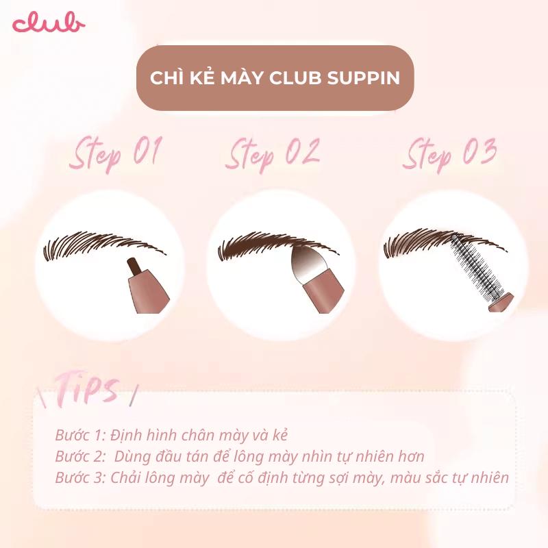 - Chì kẻ mày Club Suppin với 3 tính năng trong 1 cây kẻ mắt nhỏ gọn, cho bạn sở hữu đôi lông mày đẹp chỉ trong nháy mắt, tạo nên cấu trúc lông mày như mong muốn theo cách tự nhiên nhất.