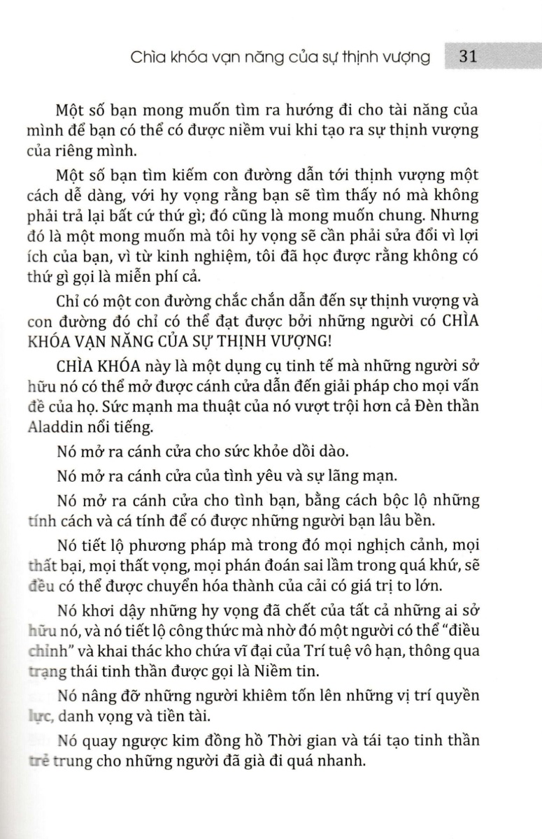 Do đó, sở hữu Chìa khóa vạn năng, bạn đọc có thể mở ra các giải pháp cho mọi vấn đề mình gặp phải, dễ dàng chuyển hóa những thất bại trong quá khứ thành những tài sản vô giá và đạt được Mười Hai Tài Sản Vĩ Đại, trong đó có cả đảm bảo tài chính.