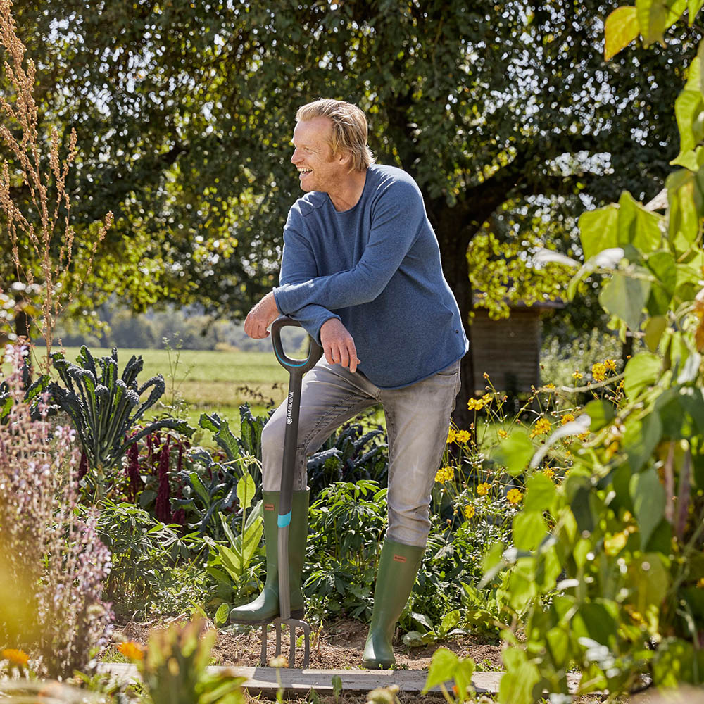 Chĩa trồng cây cán dài 117cm Gardena 17013-20 thích hợp để đào tơi xốp đất ngay cả trong các khu vực có cây trồng mà không làm hỏng rễ cây.