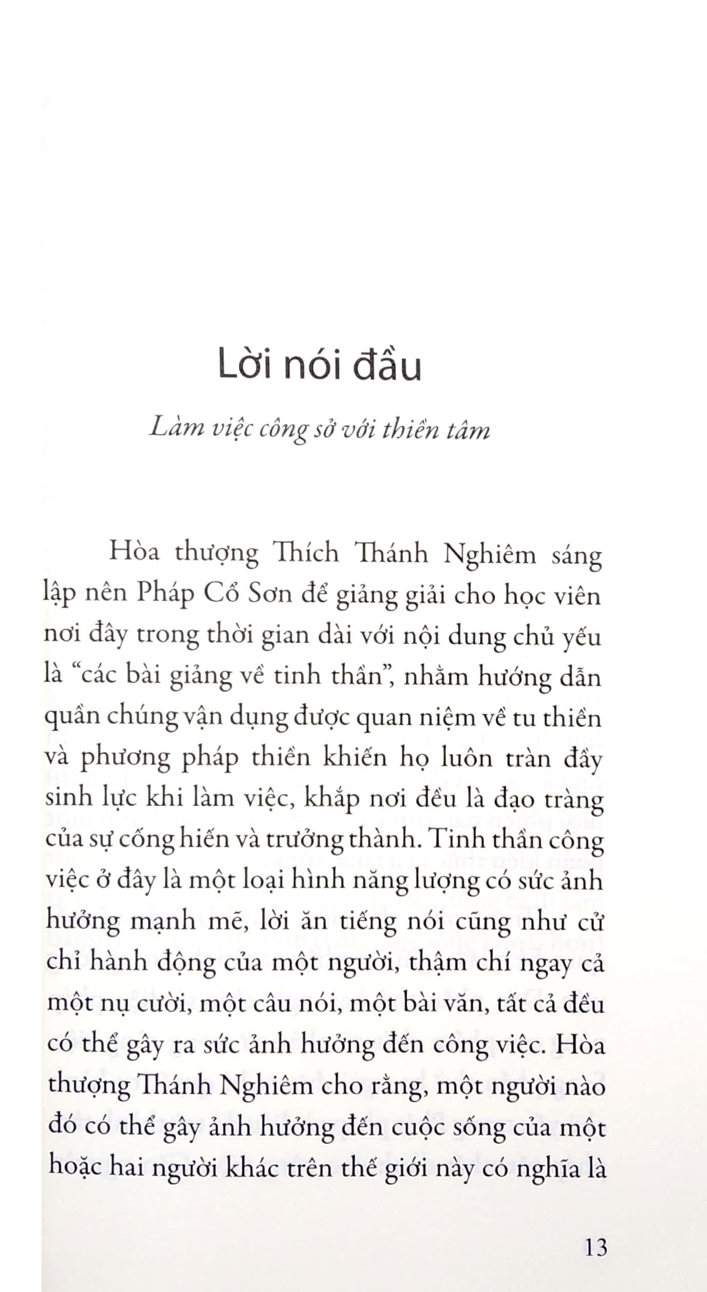 Cuốn sách này đề cập đến những vấn đề nghi hoặc khó hiểu thường gặp trong công việc, cùng với đó là sự phá cách về cách đặt câu hỏi, cách vào đề thực dụng nhất, trực tiếp nhất. Mặc dù công việc thiên biến vạn hóa, thay đổi nhanh chóng như thế nào, khi có thiền pháp làm phương pháp an định nhân tâm thì dù gặp kẻ có lòng tham, kẻ hay nghi hoặc, ta đều có thể giữ được tâm thiền, trong lòng luôn cảm thấy thanh tịnh, công việc không còn bó hẹp trong khoảng thời gian từ 9 giờ sáng đến 5 giờ chiều nữa, mà ta sẽ mở ra chân trời mới. Hãy để chúng ta đi làm bằng thiền tâm, để tinh thần càng sảng khoái hơn! Hy vọng rằng sau khi tất cả các vấn đề được hóa giải bằng thiền tâm thì mọi phiền não trong công việc đều trở thành một phần kiến thức của cuộc sống.