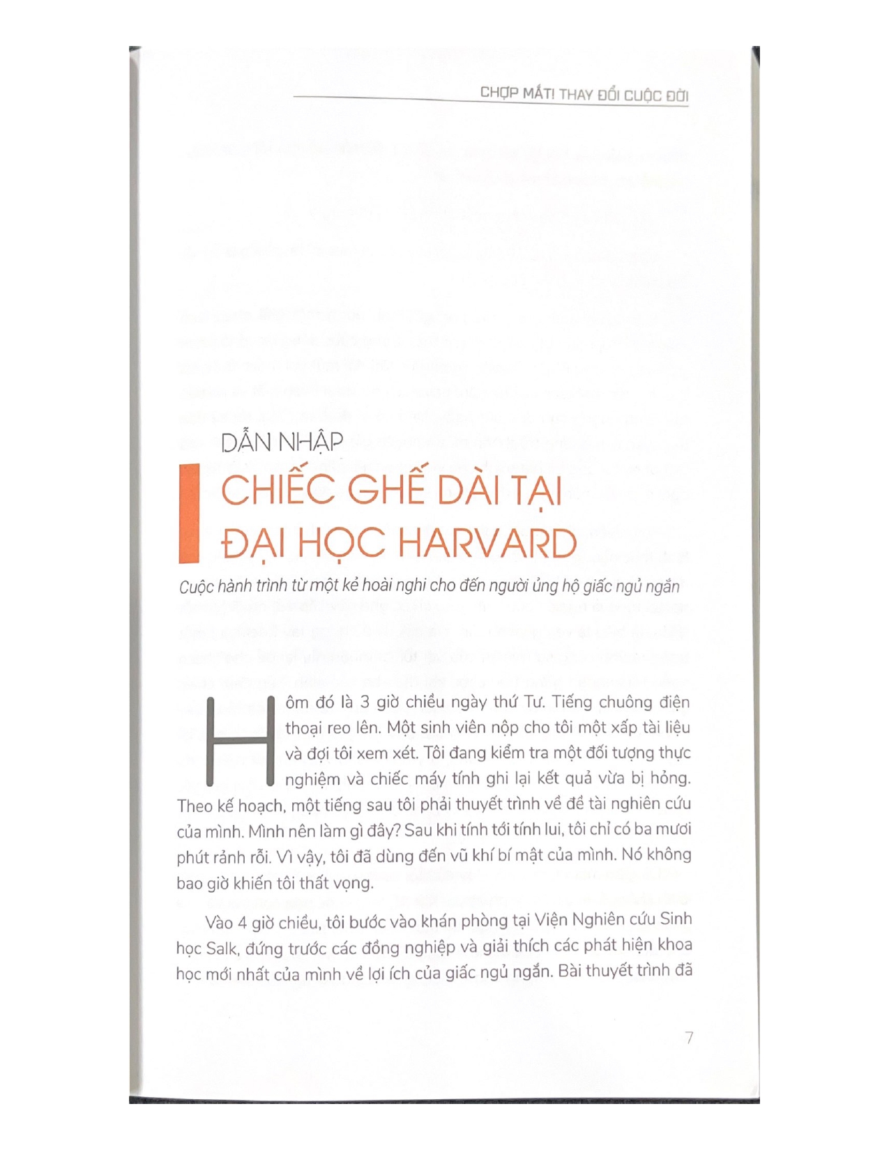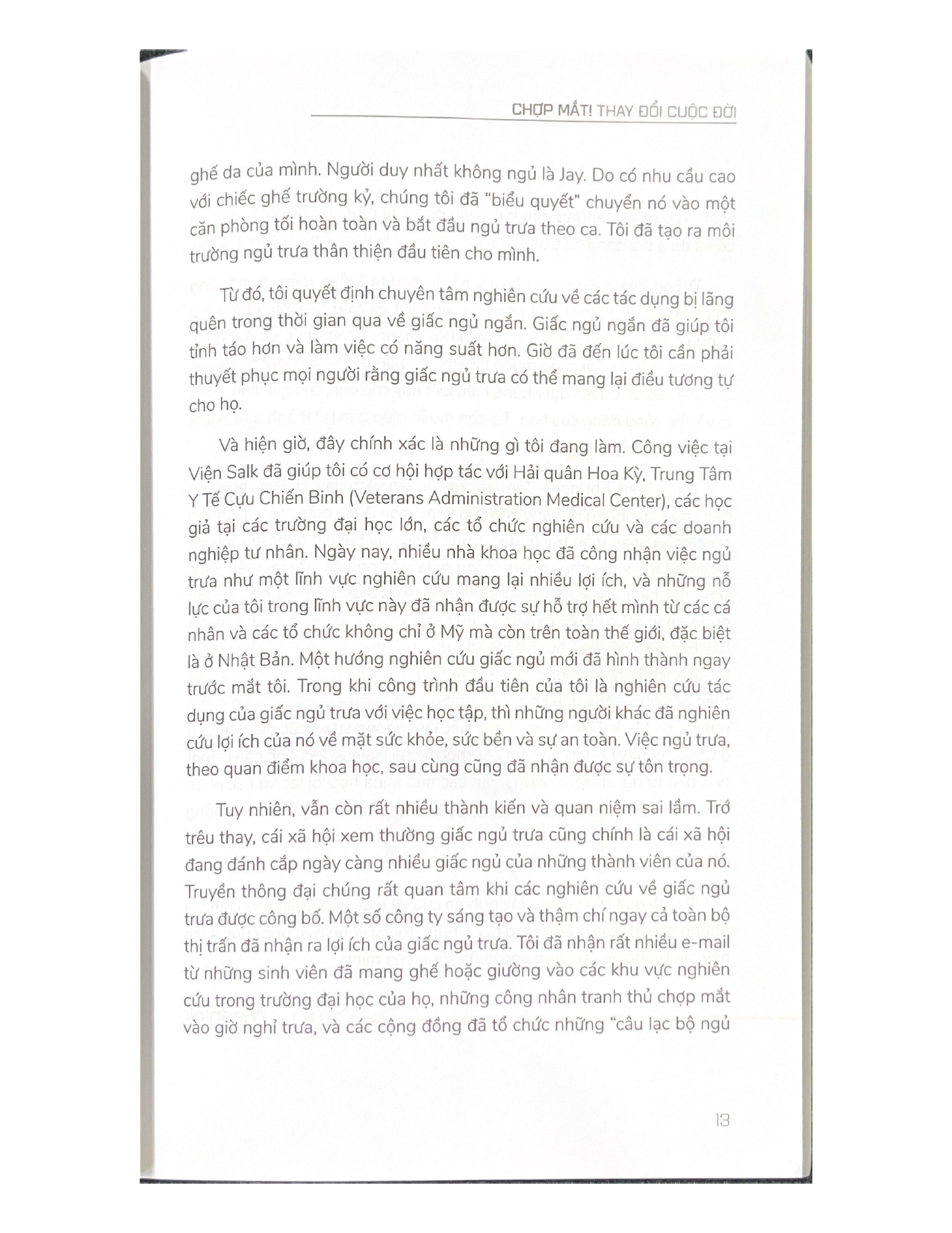 Chợp Mắt! Thay Đổi Cuộc Đời - Take A Nap! Change Your Life-Vanlangbooks I.Giới thiệu sách Quyển sách mang tính đột phá này của tiến sĩ Sara C. Mednick và Mark Ehrman đã cung cấp các bằng chứng thuyết phục, chứng minh một giấc ngủ ngắn vào buổi trưa sẽ mang lại những lợi ích về tâm sinh lý lẫn nhận thức. Nếu bạn muốn luôn tỉnh táo, năng động và có tâm trạng tốt trong cả ngày dài thì hãy chợp mắt một chút”.