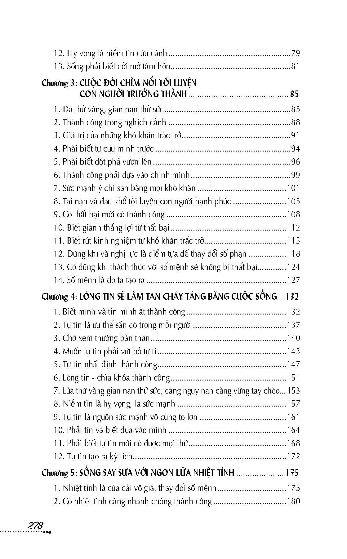 Những bài học sâu sắc cùng những lời khuyên chân thành về sự kiên rì, nỗ lực, sống có ý chí, tôi luyện để có lòng tin, sự nhiệt tình, bền chí, không cam chịu số phận, giữ cho tâm hồn luôn trong sáng, cố gắng phấn đấu, luôn chủ động thay đổi được vận mệnh của mình để có cuộc sống tươi đẹp, thành công và hạnh phúc.