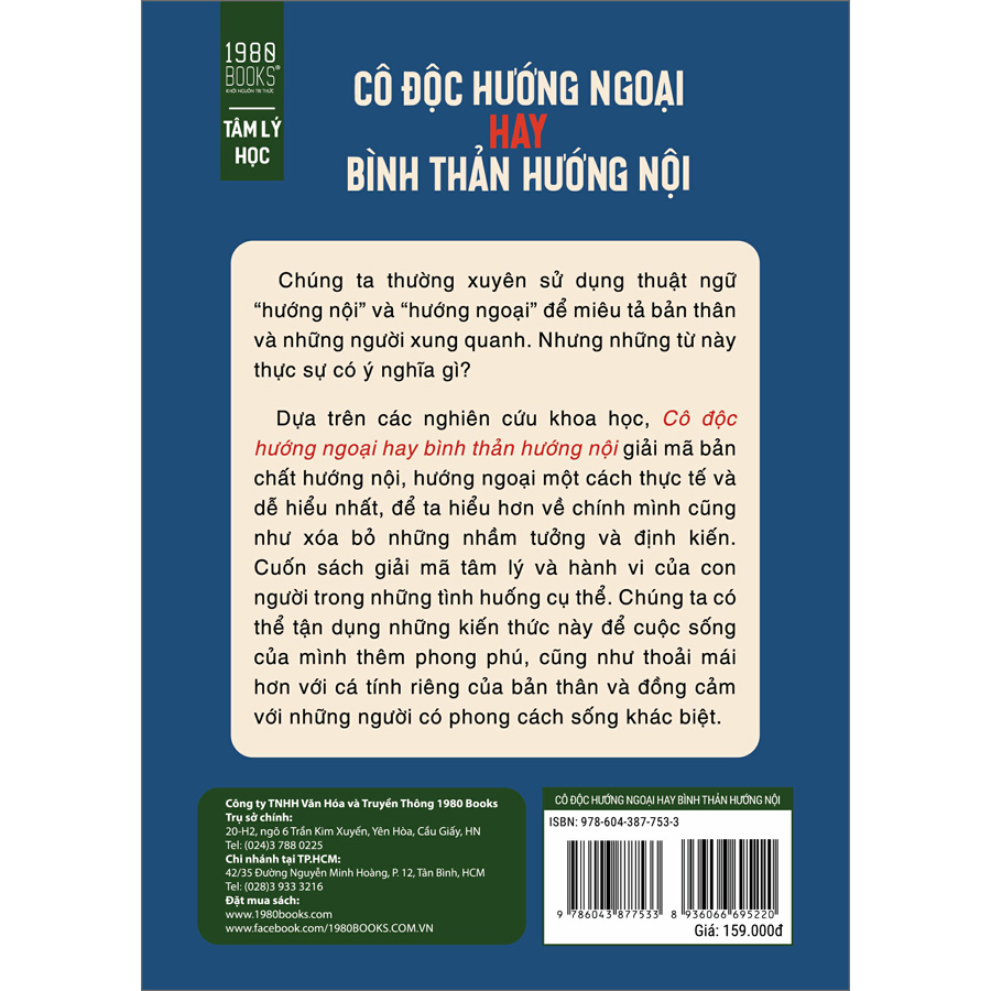 Dựa trên các nghiên cứu khoa học, cuốn sách “Cô độc hướng ngoại hay bình thản hướng nội” giải mã bản chất hướng nội, hướng ngoại một cách thực tế và dễ hiểu nhất, để ta hiểu hơn về chính mình và xóa bỏ những nhầm tưởng. Đây là một cuốn sách giàu tính thực chiến, đi sâu vào nguồn gốc của các kiểu tính cách, qua đó giải mã tâm lý và hành vi của con người trong những tình huống cụ thể. Chúng ta có thể tận dụng những kiến thức này để cuộc sống của mình thêm phong phú, cũng như thoải mái hơn với cá tính riêng của bản thân và đồng cảm với những người có phong cách sống khác biệt.