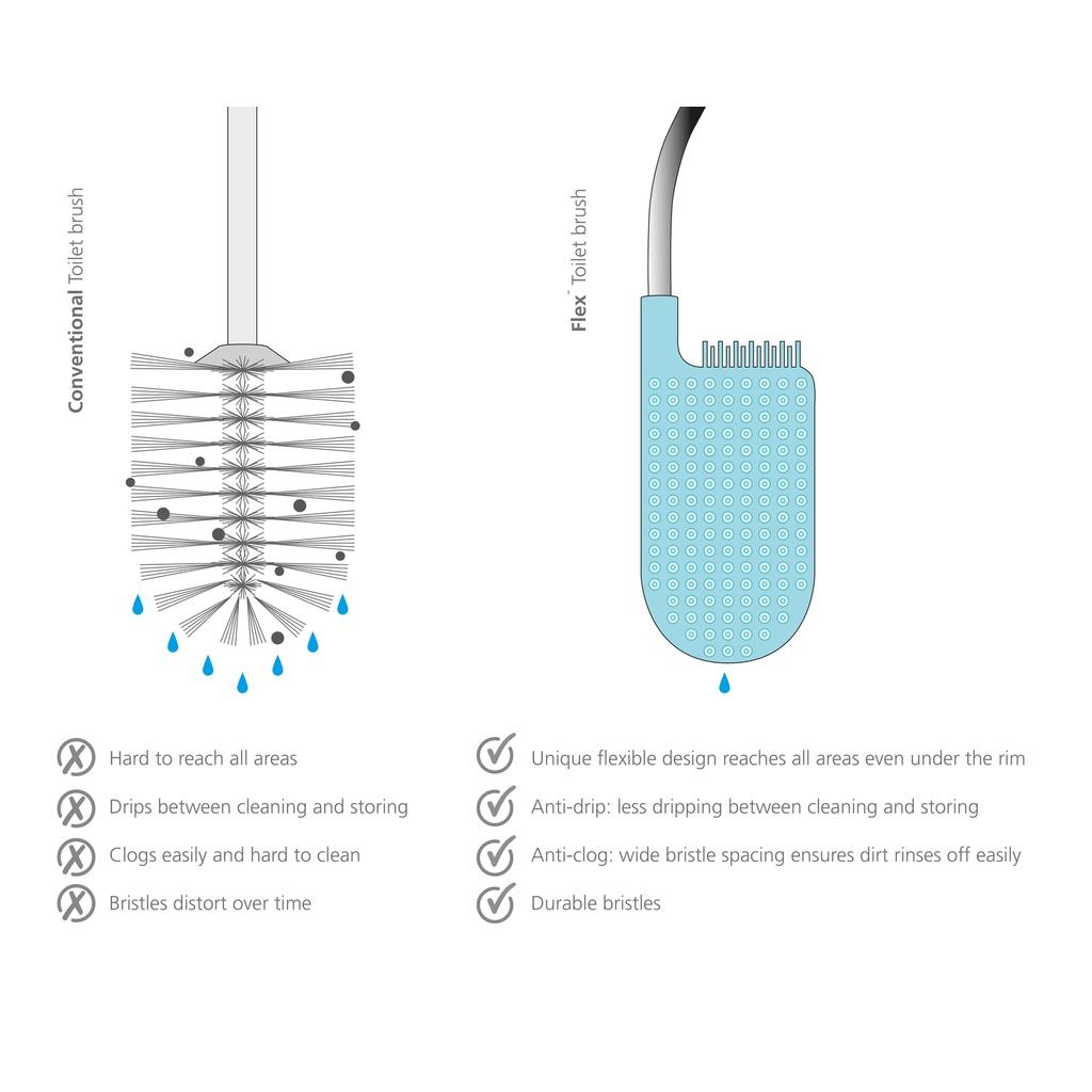 Description: Our revolutionary Flex toilet brush has a unique D-shaped, flexible head with wide bristles to effectively and hygienically clean the toilet. Flexible, D-shaped head reaches all areas, even under the rim Anti-drip: less dripping between cleaning and storing Anti-clog design: wide bristle spacing ensures dirt rinses off easily Durable bristles Comes with a slimline holder for neat storage