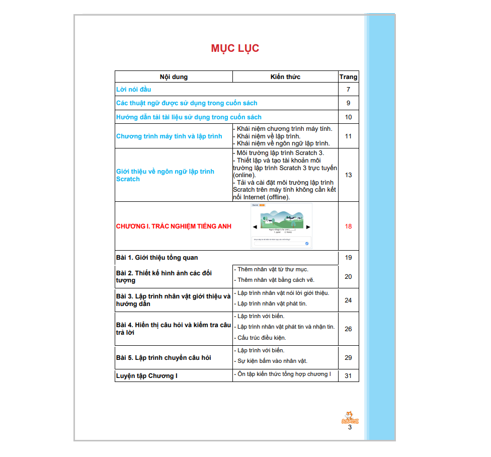 Cuốn sách Coding 5 lập trình với Scratch 3 bao gồm 06 chương, cung cấp những kiến thức tiếp theo về lập trình như: vòng lặp lồng nhau, thủ tục, danh sách, … thông qua ngôn ngữ lập trình Scratch 3. Từng chương trong cuốn sách Coding 5 sẽ giúp trẻ xây dựng lên các phần mềm phù hợp với lứa tuổi và gần gũi với các môn học khác như: Trắc nghiệm tiếng Anh, trò chơi trắc nghiệm, tri ân thầy cô, máy tính bỏ túi, trò chơi Điện biên phủ trên không, dịch ngôn ngữ.
