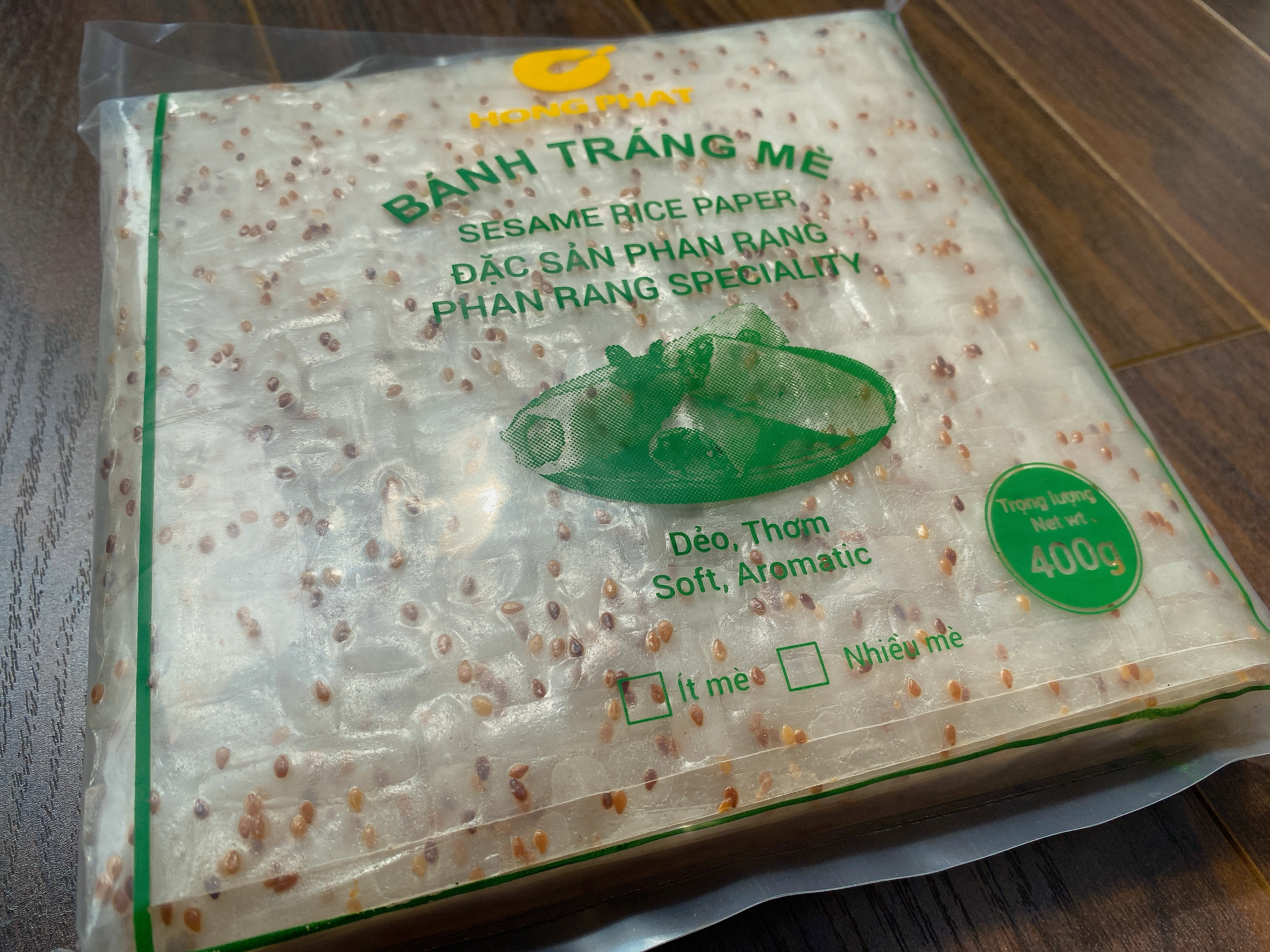 Bánh tráng mè, bánh tráng gỏi cuốn mè Hồng Phát đặc sản Phan Rang gói 400g Sản phẩm làm từ Gạo, bột khoai mì, muối và hạt mè. Nhúng đẫm bánh tráng vào nước. Bánh