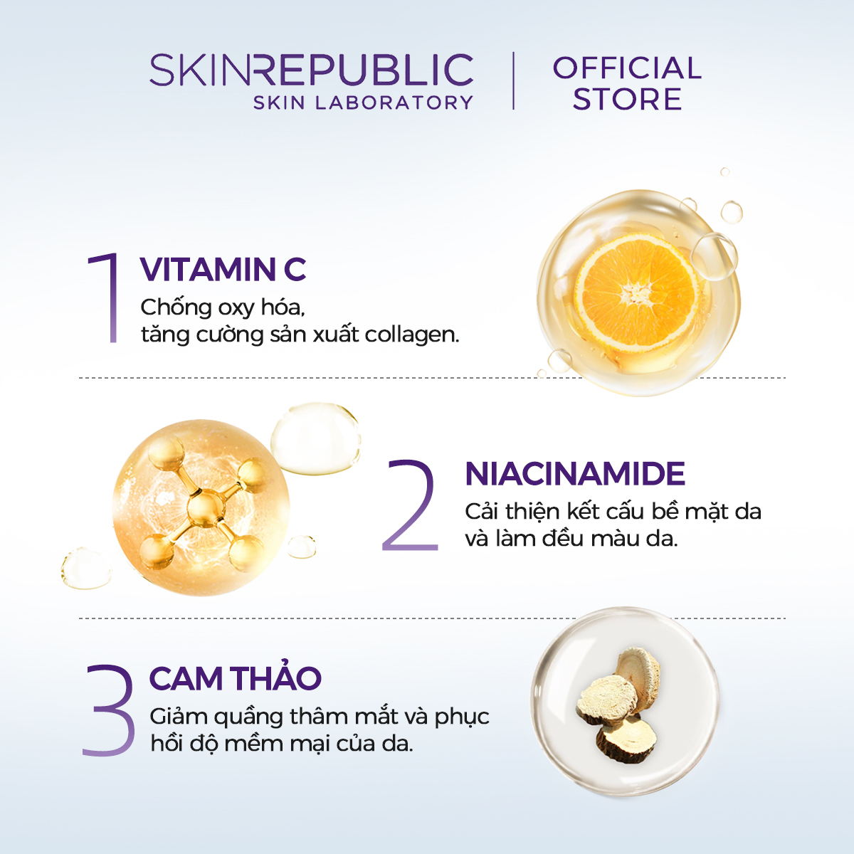 - Cam thảo Là một thành phần làm sáng da tự nhiên, chiết xuất cam thảo có chứa hoạt chất glabridin, có tác dụng ức chế tyrosinase, enzyme gây ra sắc tố khi tiếp xúc với ánh nắng mặt trời và có hiệu quả trong việc làm giảm các đốm nâu, giảm tình trạng tăng sắc tố và quầng thâm dưới mắt. Cam thảo cũng cải thiện tình trạng da khô/thô ráp bằng cách giảm bong tróc và phục hồi độ mềm mại. Thành phần công bố: Aqua/Water/Eau, Butylene Glycol, Glycereth-26, Niacinamide, Propylene Glycol, Benzyl Glycol, Bis-PEG-18 Methyl Ether Dimethyl Silane, Triethanolamine, Carbomer, Peg-60 Hydrogenated Castor Oil, Ethylhexylglycerin, Betaine, Allantoin, Disodium EDTA, Raspberry Ketone, Carrageenan, Sucrose, Ascorbyl Glucoside, Dipotassium Glycyrrhizate, Morus Alba Bark Extract, Tocopheryl Acetate, Rosa Centifolia Flower Water, Pentylene Glycol, Ascorbic Acid, 1,2-Hexanediol, Caprylyl Glycol, Camellia Sinensis Leaf Extract, Coffea Arabica (Coffee) Seed Extract, Diospyros Kaki Leaf Extract, Theobroma Cacao (Cocoa) Extract, Wine Extract, Polyglutamic Acid, Linalool, Citronellol, Parfum/Fragrance. Thông tin cơ bản: