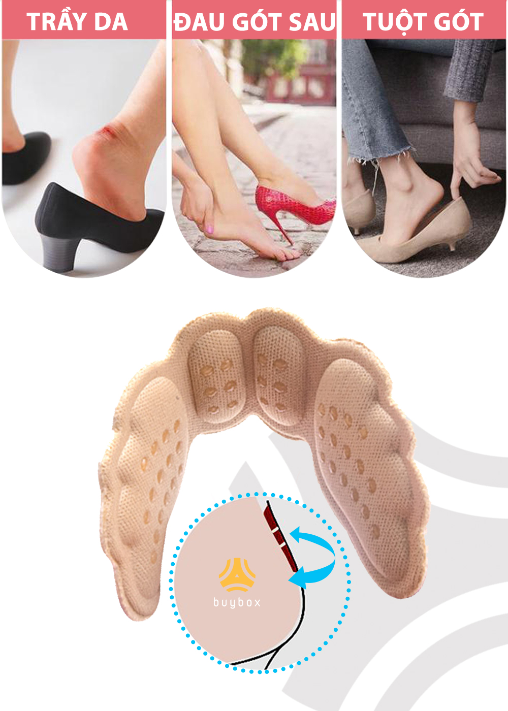 CÔNG DỤNG NỔI BẬC Lót giày đa năng chống rộng buybox là sự kết hợp giữa lót giày và lót chống trầy gót chân. Giúp chống rộng giày, giảm size.