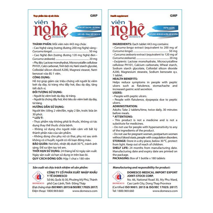 Viên nghệ vàng DOMESCO - Hộp 180 viên Thành phần Cao Nghệ vàng (tương đương 200 mg Nghệ vàng – Curcuma longa) ……. 50 mg Cao Nghệ đen (tương đương 120 mg Nghệ đen –