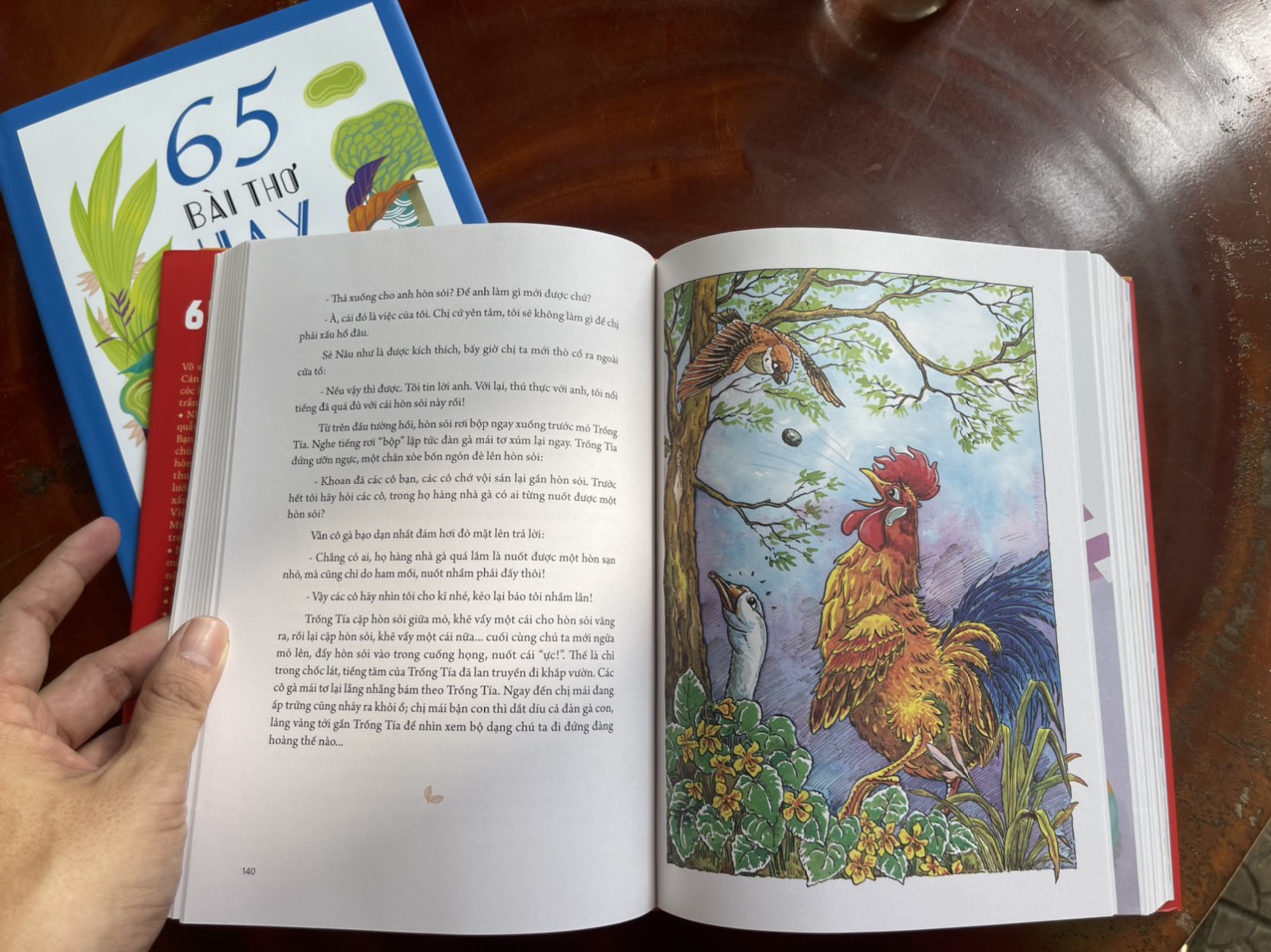 Như bộ sách này nếu chỉ nhìn ảnh bìa tôi cũng không có cảm nhận được, nhưng khi được cầm trực tiếp trên tay tôi mới biết nó giá trị chừng nào. Dày dặn, trên chất giấy hoàn hảo, rực sỡ sắc màu như cánh đồng hoa để con chữ tung tăng. Hạnh phúc thay cho các tác giả, họa sỹ được góp mặt trong tuyển tập mà tôi tưởng như tập đại thành của văn học Việt viết “cho tôi xin một vé đi tuổi thơ”. Tôi viết vậy có ý là đây là tập Việt Văn giàu giá trị văn chương, ý tưởng cao đẹp chứ không phải là đểẻ con ở nhà đọc. Bạn hãy cảm nhận qua ảnh tôi chụp, tôi đã rất xúc động khi chụp nó. 65 truyện ngắn hay và rất nhiều lời văn đẹp… Võ sĩ Bọ Ngựa ◆ Ông đồ Bể ◆ Ông Cản Ngũ ◆ Con chuột Láu ◆ Con cóc là cậu ông Giời ◆ Áo em cài hoa trắng ◆ Cây bánh tét của người cô ◆ Những chiếc áo ấm ◆ Tiếng cá quẫy ◆ Ngày công đầu của cu Tý ◆ Bạn nhỏ trong rừng ◆ Ông Pồn và chú hổ con ◆ Cuộc phiêu lưu của hòn sỏi ◆ Tớ giống ông tớ ◆ Chiếc thuyền lá tre ◆ Con mèo và chú bé lười ◆ Ông bố đảm đang ◆ Cậu bé xấu xí ◆ Ông già chép sử trong Viện Hàn lâm ◆ Chú sếu Vương Miện ◆ Cô bé tóc bím ◆ Chiếc bánh trong đáy túi ◆ Cô bé mảnh khảnh ◆ Ngọn lá bay đi ◆ Một lần và mãi mãi ◆ Bến tàu trong thành phố ◆ Bà nội ◆ Thi nhạc ◆ Bẫy cò ◆ Rùa trắng ◆ Vầng trăng của bà ◆ Cô bé Ốc Sên ◆ Nàng tiên xứ tuyết ◆ Quán Búp bê ◆ My Darling ◆ Những con thuyền chở Tết ◆ Ban mai ◆ Ba cô xá chí ma vương ◆ Không phải thứ gì cũng mua được ◆ Hai con diều bay thấp ◆ Cá lớn cá bé ◆ Ngày của ngoại ◆ Ông nội ◆ Người gác bình minh ◆ Thầy lang hai mặt ◆ Máy bay lên Pú Khớ ◆ Seo May ◆ Mưa núi ◆ Hoàng tử Rơm ◆ Tiền của thần cây ◆ Bí mật Bọ hung ◆ Mùa đông ở xóm Chân Cầu ◆ Bộ ba hoàn hảo ◆ Nghé con không muốn lớn ◆ Chú Cănggu-ru hạnh phúc ◆ Đi chợ hoa mua Xì Dầu ◆ Chú gà trống mộng du ◆ Chung cư cổ tích ◆ Thế giới của con ◆ Hột vịt lộn và chè đậu xanh đánh ◆ Tắc Kè Hoa ◆ Người bạn cây ◆ Bí mật đôi cánh hoa bay ◆ Những bí mật trong Tuần thiên nhiên ◆ Chuột Chít và hai chiếc giầy đến xứ Tít Mù Tắp. 65 tác giả tài danh cùng chuyến du hành kì diệu trong thế giới văn học viết cho trẻ thơ… Tô Hoài ◆ Khái Hưng ◆ Kim Lân ◆ Vũ Tú Nam ◆ Nguyễn Huy Tưởng ◆ Võ Hồng ◆ Phạm Hổ ◆ Võ Quảng ◆ Trần Thanh Địch ◆ Bùi Hiển ◆ Ngô Quân Miện ◆ Ma Văn Kháng ◆ Nguyễn Kiên ◆ Hải Hồ ◆ Thy Ngọc ◆ Nguyễn Quang Sáng ◆ Viết Linh ◆ Hà Ân ◆ Lê Vân ◆ Nguyễn Quỳnh ◆ Phong Thu ◆ Mã A Lềnh ◆ Trần Hoài Dương ◆ Hồng Nhu ◆ Thanh Quế ◆ Xuân Quỳnh ◆ Duy Khán ◆ Nguyễn Phan Hách ◆ Tạ Duy Anh ◆ Nguyễn Quang Thiều ◆ Trần Thiên Hương ◆ Lê Phương Liên ◆ Thùy Dương ◆ Quế Hương − Nguyên Hương ◆ Kim Hài − Lý Lan ◆ Lê Nguyên Ngữ ◆ Đoàn Thạch Biền ◆ Nguyễn Thái Hải ◆ Lưu Thị Lương ◆ Nguyễn Ngọc Thuần ◆ Thụy Anh ◆ Nguyễn Thị Châu Giang ◆ Nguyễn Thị Bích Nga ◆ Du An ◆ Lục Mạnh Cường ◆ Nông Quang Khiêm ◆ Nguyễn Thị Kim Hòa ◆ Võ Diệu Thanh ◆ Lê Minh Nhựt ◆ Trương Bảo Châu ◆ Ngọc Linh ◆ Hương Thị ◆ Võ Thu Hương ◆ Nguyễn Thị Thanh Bình ◆ Lê Quang Trạng ◆ Cao Nguyệt Nguyên ◆ Dương Hằng ◆ Nguyễn Ngọc Hoài Nam ◆ Trần Tùng Chinh ◆ Khánh Liên ◆ Đinh Thu Hằng ◆ Phan Hà Anh ◆ Vũ Thị Thanh Tâm.