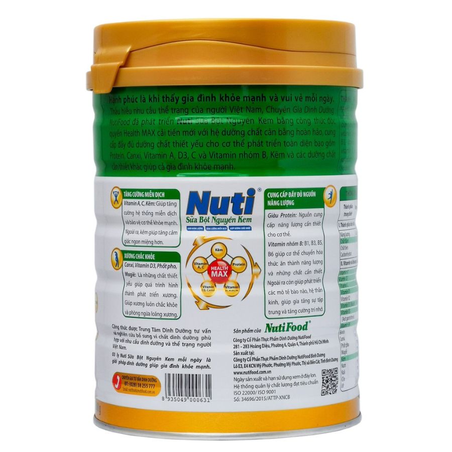 Mô Tả Sản Phẩm Thấu hiểu nhu cầu thể trạng của người Việt Nam, Chuyên Gia Dinh Dưỡng NutiFood đã phát triển Nuti Nguyên Kem bằng công thức độc quyền Health MAX cải tiến mới với hệ dưỡng chất cân bằng hoàn hảo cung cấp đầy đủ dưỡng chất thiết yếu cho cơ thể phát triển toàn diện bao gồm Protein, Canxi, Vitamin A, Vitamin D, Vitamin nhóm B, Kẽm và các dưỡng chất cần thiết khác giúp cả gia đình khỏe mạnh. Thông tin sản phẩm Nuti Nguyên Kem:         Công thức được Trung tâm Dinh Dưỡng tư vấn và nghiên cứu bổ sung vi chất dinh dưỡng phù hợp với nhu cầu dinh dưỡng và thể trạng người Việt Nam.        03 ly Nuti Sữa Bột Nguyên Kem mỗi ngày là giải pháp dinh dưỡng giúp gia đình khỏe mạnh.  Thành phần sữa nuti Nguyên kem:             Sữa bột nguyên kem (84%), đường sucrose, hương liệu tổng hợp dùng cho thực phẩm, hỗn hợp vitamin ( vitamin B1, vitamin B3, vitamin B5, vitamin B6, Vitamin A, Vitamin D3), kẽm sunphat. Có chứa sữa. Hướng dẫn sử dụng Cách pha sữa: