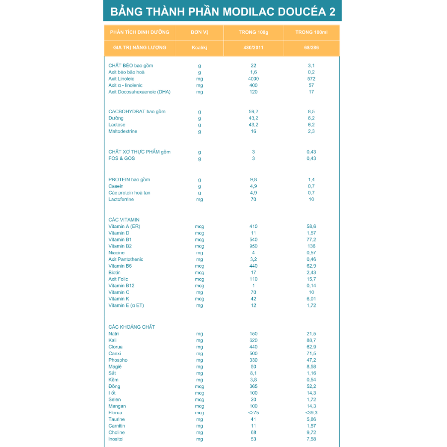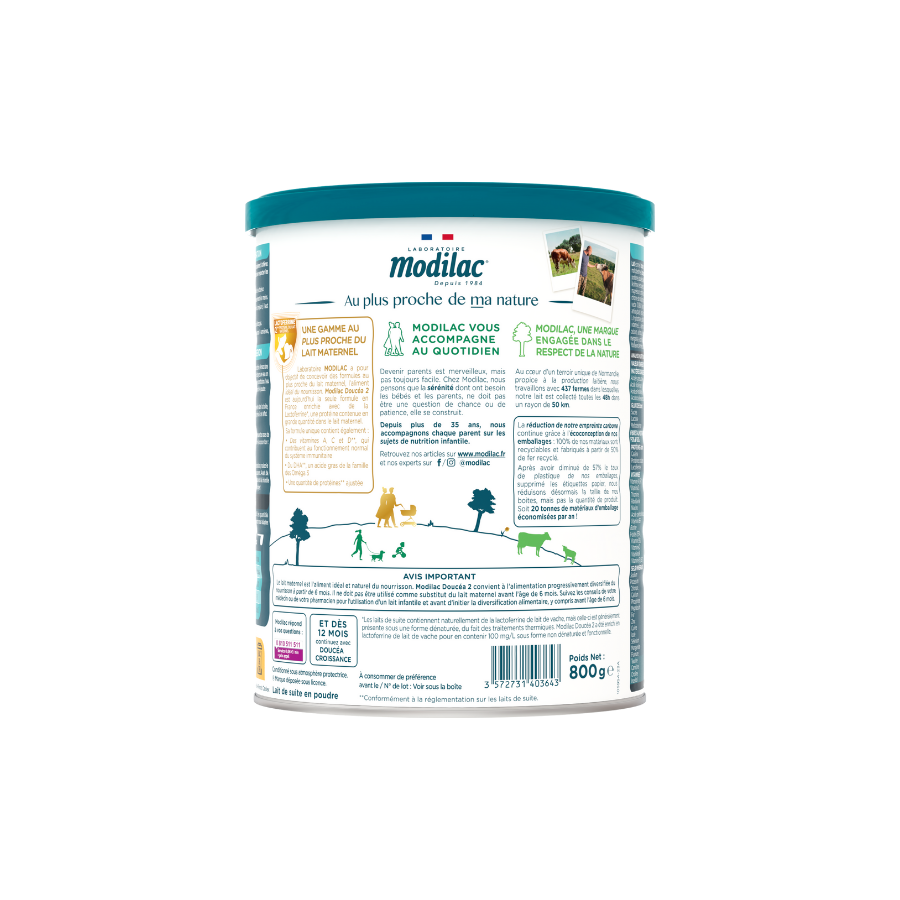 • Mỗi lon sữa Modilac Doucéa đều trải qua hơn 40 năm cải tiến không ngừng, phù hợp với sự phát triển của bé.
