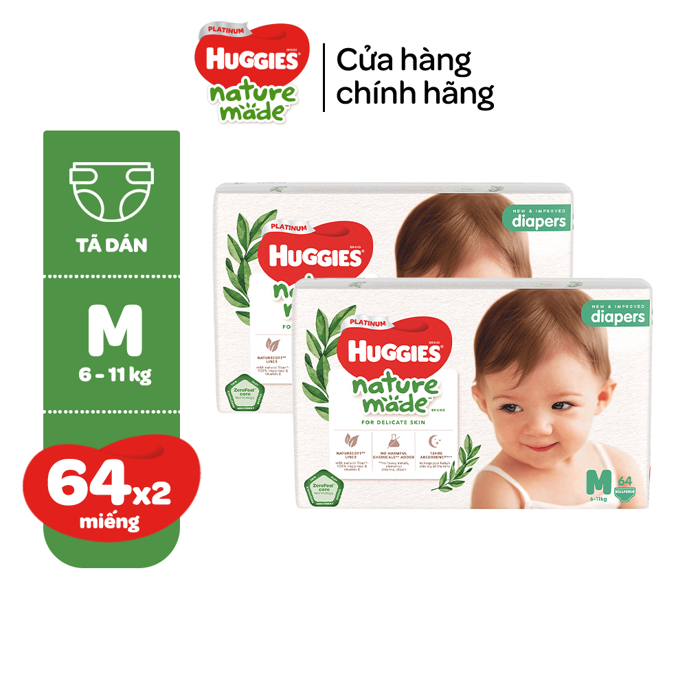 Mua tại TiktokGiới thiệu BỘ SẢN PHẨM BAO GỒM: 02 x Tã/Bỉm dán Huggies Platinum NatureMade M64/L54/XXL44 Bỉm tã dán Huggies Platinum Nature Made miếng cải tiến từ dòng Platinum cao cấp, mang tới các ưu điểm nổi bật hơn về chất liệu. Tã giấy sử dụng 100% nguyên liệu sợi tự nhiên nhập khẩu từ Châu Âu, bổ sung thêm vitamin E chăm sóc tốt nhất cho làn da mỏng manh và nhạy cảm của bé. Bên cạnh đó, sản phẩm vẫn tiếp tục duy trì các công nghệ cao cấp từ dòng Platinum như thiết kế siêu mỏng nhẹ chỉ 5mm, lõi bông 360 độ siêu linh hoạt, không vón cục, bề mặt 3D thấm hút nhanh và khả năng thấm hút vượt trội duy trì khô thoáng tới 12 tiếng. Thông tin kích thước