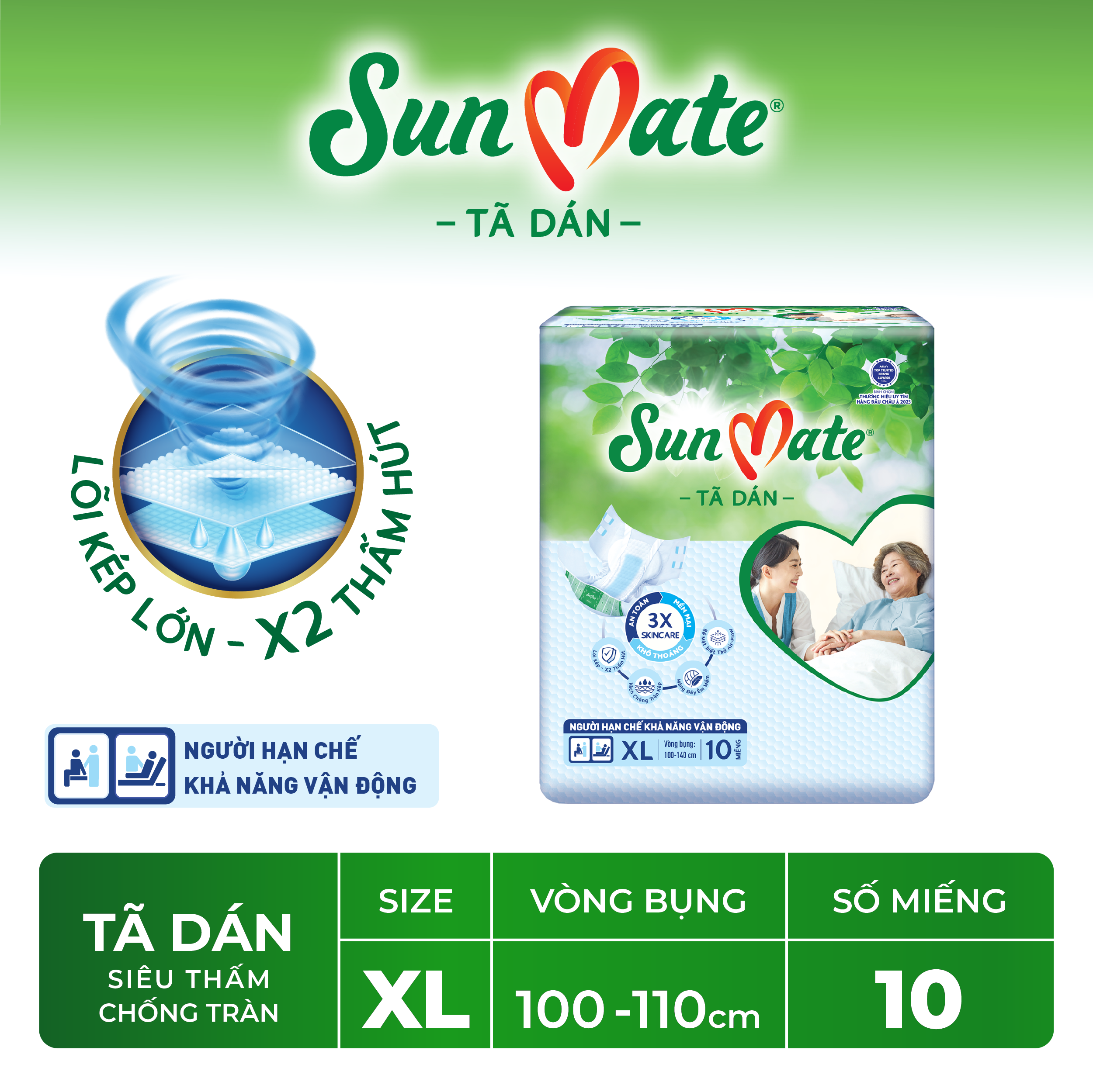 - Với công nghệ tiên tiến nhất tạo ra các sản phẩm mềm mại, thoáng khí, khả năng kháng khuẩn, nhằm giảm thiểu sự phát triển mùi và thấm hút cực nhanh, SunMate là lựa chọn tối ưu cho việc chăm sóc vệ sinh người cao tuổi, giúp họ luôn thoải mái, an toàn tự tin vui sống mỗi ngày. SunMate là người bạn đồng hành giúp chăm sóc người thân yêu tốt nhất.