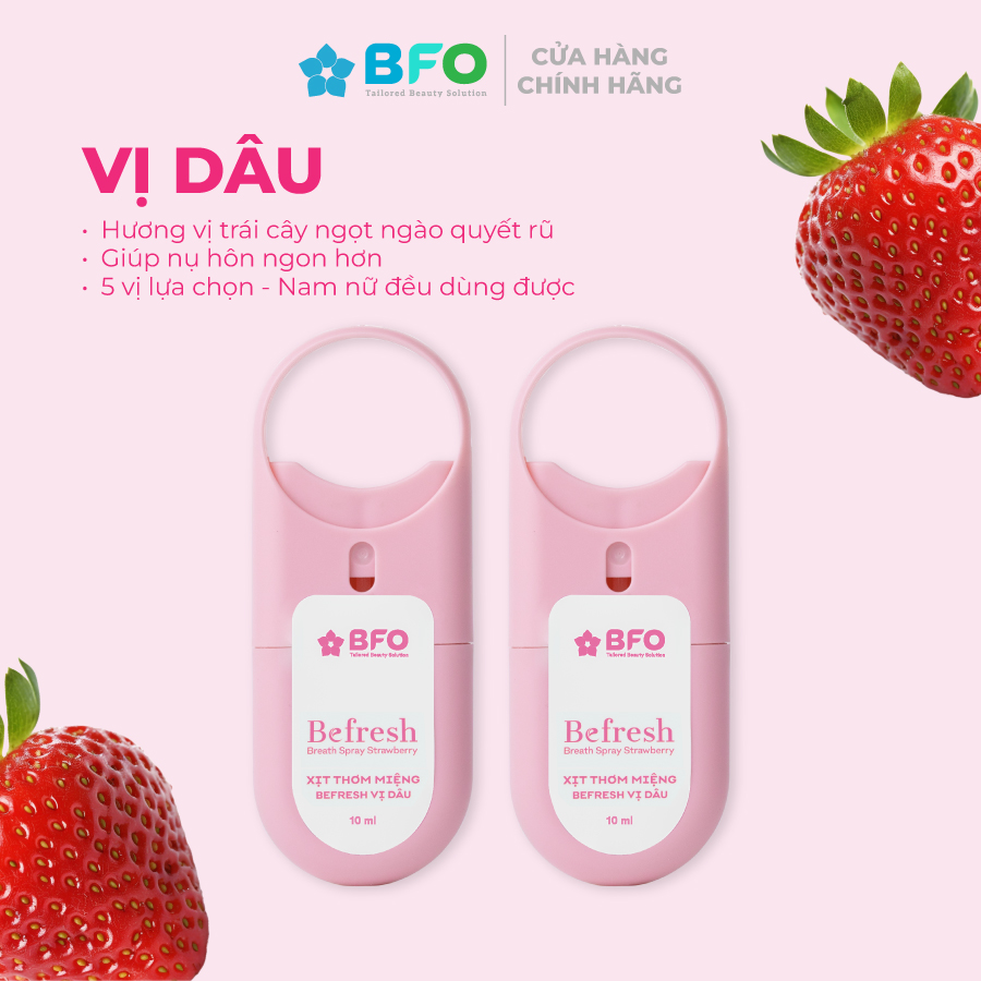 Combo 2 Xịt Thơm Miệng Befresh Cho Hơi Thở Thơm Mát Chỉ Trong 3 Giây Dung Tích 10ml ƯU ĐIỂM NỔI BẬT: Khử mùi hôi trong khoang miệng nhanh chóng chỉ trong 3 giây, giúp hơi thở thơm mát, sảng khoái. Chiết xuất từ tinh dầu trà xanh - bạc hà hoàn toàn thiên nhiên, cho hương thơm tự nhiên, không nồng, không khó chịu, an toàn khi nuốt. Thiết kế nhỏ gọn, tiện lợi, luôn sẵn sàng bên bạn trong bất kỳ cuộc hẹn nào. Sản phẩm không thể thay thế kem đánh răng và nước súc miệng, do đó bạn nên kết hợp đánh răng, súc miệng và xịt miệng để đảm bảo sức khỏe răng miệng và tự tin với khoang miệng sạch thơm suốt ngày dài. THÀNH PHẦN: Tinh dầu bạc hà có công dụng khử mùi hôi, hỗ trợ làm sạch răng miệng. Tinh dầu trà xanh giúp ngăn ngừa sâu răng, hạn chế các vấn đề về nướu và chân răng. Vị the mát sảng khoái giúp giảm căng thẳng, tăng cường năng lượng, kích thích sự tập trung tinh thần. MÙI HƯƠNG 4 LOẠI: VỊ ĐÀO ️ VỊ DÂU BẠC HÀ TRÀ XANH - BẠC HÀ DƯA LƯỚI HƯỚNG DẪN BẢO QUẢN: Đậy nắp kín sau khi sử dụng. Bảo quản nơi khô ráo, thoáng mát. Tránh nhiệt độ cao. Tránh ánh nắng trực tiếp. Xuất xứ: Việt Nam THÔNG TIN THƯƠNG HIỆU: Thương hiệu BFO: Tự hào là chuỗi cửa hàng cung cấp các sản phẩm chăm sóc và làm đẹp toàn diện, giá tốt, chất lượng độc tôn trên toàn Châu Á. Với niềm tin mãnh liệt trong từng sản phẩm tạo ra, BFO hy vọng mang lại những trải nghiệm tốt nhất cho người tiêu dùng: HIỆU QUẢ - TỐI GIẢN - THOẢI MÁI.