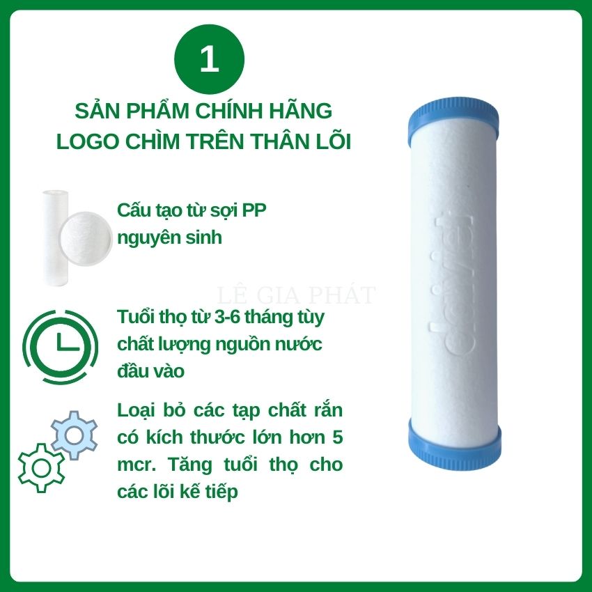 Mua tại Tiktok- Lõi số 1 : PP 10 inch kích thước 5 Micromet. Công dụng: Lọc các cặn bẩn kính thước lớn hơn 5 micromet, lọc chất huyền phù, các dạng rỉ sét, bùn đất hay các vật chất lơ lửng trong nước đồng thời ngăn cản bớt các yếu tố vi sinh trần vào bên trong hệ thống. Cấu tạo: Được cấu tạo từ sợi PP nguyên sinh. Thời gian thay : Từ 3-6 tháng tuỳ nguồn nước. Chất liệu: PP nguyên sinh nén