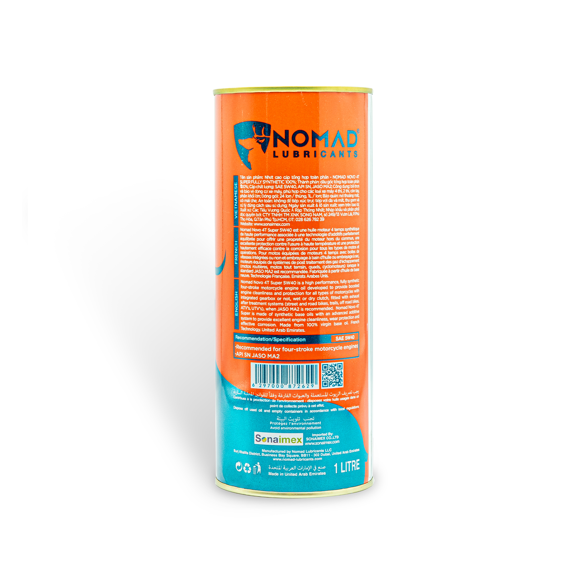 - Đóng thùng: 24 chai/ thùng VỀ THƯƠNG HIỆU DẦU NHỚT NOMAD LUBRICANTS Nomad Lubricants được thành lập năm 1998 tại xứ sở dầu mỏ khổng lồ Dubai. Ban đầu, Nomad chỉ tập trung vào một số dòng sản phẩm dầu nhớt chuyên biệt, dầu thủy lực và nước làm mát động cơ. Đến năm 2005, công ty bắt đầu mở rộng hoạt động sản xuất qua dầu nhớt vận tải, công nghiệp và hàng hải. Năm 2010, công ty mở rộng gấp đôi diện tích và công suất sản xuất. Năm 2015, công ty đầu tư dây chuyền công nghệ hiện đại từ Pháp, cho ra đời nhiều sản phẩm dầu nhớt tổng hợp toàn phần chất lượng cao, đáp ứng hoàn hảo các tiêu chuẩn quốc tế về dầu nhờn. Năm 2017, Nomad hợp tác cùng Công Ty TNHH TM Xuất Nhập Khẩu Song Nam (Sonaimex) bắt đầu phân phối thương hiệu Nomad tại thị trường Việt Nam. Công nghệ sản xuất hiện đại của Nomad kết hợp sự thấu hiểu thị hiếu người tiêu dùng nội địa của Sonaimex đã cho ra mắt dòng nhớt tổng hợp toàn phần cao cấp chuyên biệt cho các dòng xe tay côn, dung tích đặc biệt 1.1L và 1.3L chính thức đầu tiên tại Việt Nam. Sự thành công của sản phẩm giúp thương hiệu Nomad có tiếng vang trong phân khúc khách hàng hướng đến và được người tiêu dùng yêu mến lựa chọn. Công nghệ hàng đầu Châu Âu cộng với trụ sở ngay tại xứ sở dầu mỏ, NOMAD LUBRICANTS sở hữu lợi thế về sản phẩm chất lượng cao nhưng giá thành cạnh tranh. Danh mục sản phẩm của NOMAD rất đa dạng, từ dầu nhớt dành cho xe máy, xe ô tô, vận tải, tàu thuyền, máy móc công nghiệp nặng – nhẹ, đến các dòng phụ gia và bảo dưỡng chăm sóc động cơ. VÌ SAO NÊN CHỌN NHỚT NOMAD