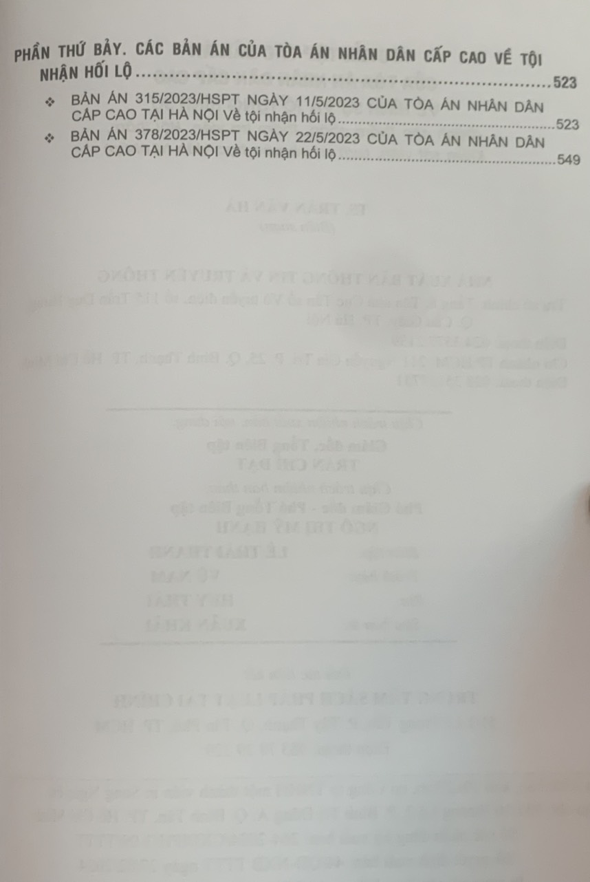 Sách Combo Tuyển tập các bản án của Tòa án nhân dân cấp cao   1.Tuyển tập các bản án của Tòa án nhân dân cấp cao về dân sự và tố tụng dân sự Tác giả: TS. TRẦN VĂN HÀ (Biên soạn) Nhà xuất bản: Thông Tin Và Truyền Thông Số trang: 560 trang Kích thước: 19x27 cm Hình thức bìa: Bìa mềm Năm xuất bản: 4.2024 Giá bìa 525.000đ 2.Tuyển tập các bản án của Tòa án nhân dân cấp cao về hình sự và tố tụng hình sự Tác giả: TS. TRẦN VĂN HÀ (Biên soạn) Nhà xuất bản: Thông Tin Và Truyền Thông Số trang: 560 trang Kích thước: 19x27 cm Hình thức bìa: Bìa mềm Năm xuất bản: 2024 Giá bìa: 535.000đ 3.Tuyển tập các bản án của Tòa án nhân dân cấp cao về quyền sử dụng đất và tài sản gắn liền với đất Tác giả: TS. TRẦN VĂN HÀ (Biên soạn) Nhà xuất bản: Thông Tin Và Truyền Thông Số trang: 560 trang Kích thước: 19x27 cm Hình thức bìa: Bìa mềm Năm xuất bản: 2024 Giá bìa 545.000đ 4.Tuyển tập các bản án của Tòa án nhân dân cấp cao về hành chính – kinh doanh thương mại – hôn nhân gia đình – lao động Tác giả: TS. TRẦN VĂN HÀ (Biên soạn) Nhà xuất bản: Thông Tin Và Truyền Thông Số trang: 528 trang Kích thước: 19x27 cm Hình thức bìa: Bìa mềm Năm xuất bản: 2024
