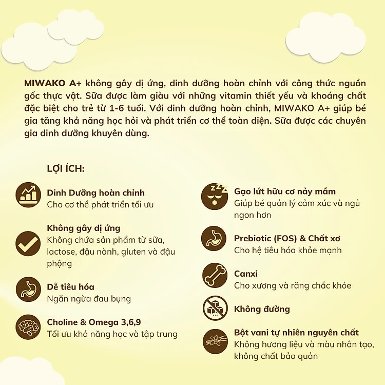 - Miwako A+ chứa đến 13 loại vitamin và 9 khoáng chất hỗ trợ tăng trưởng và phát triển cho bé