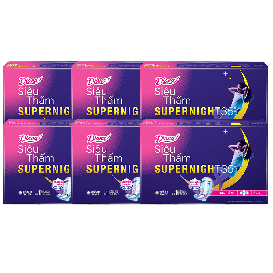 Combo 6 Băng Vệ Sinh Diana Super Night 35cm (Gói 3 Miếng) được các chuyên gia nghiên cứu và phát triển để góp phần tạo cho phái đẹp một giấc ngủ sâu trọn vẹn trong những ngày nhạy cảm.