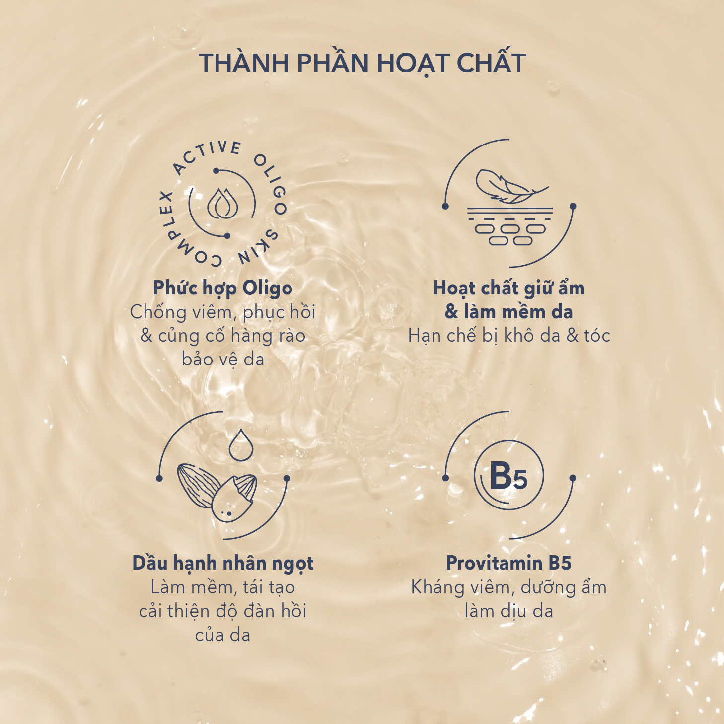 Chỉ định: Da chàm, viêm da cơ địa, dị ứng, ngứa, mẩn đỏ Cách dùng: Đỗ vài giọt vào tay và tạo bọt, nhẹ nhàng rửa sạch da mặt, da cơ thể và mái tóc. Rửa sạch