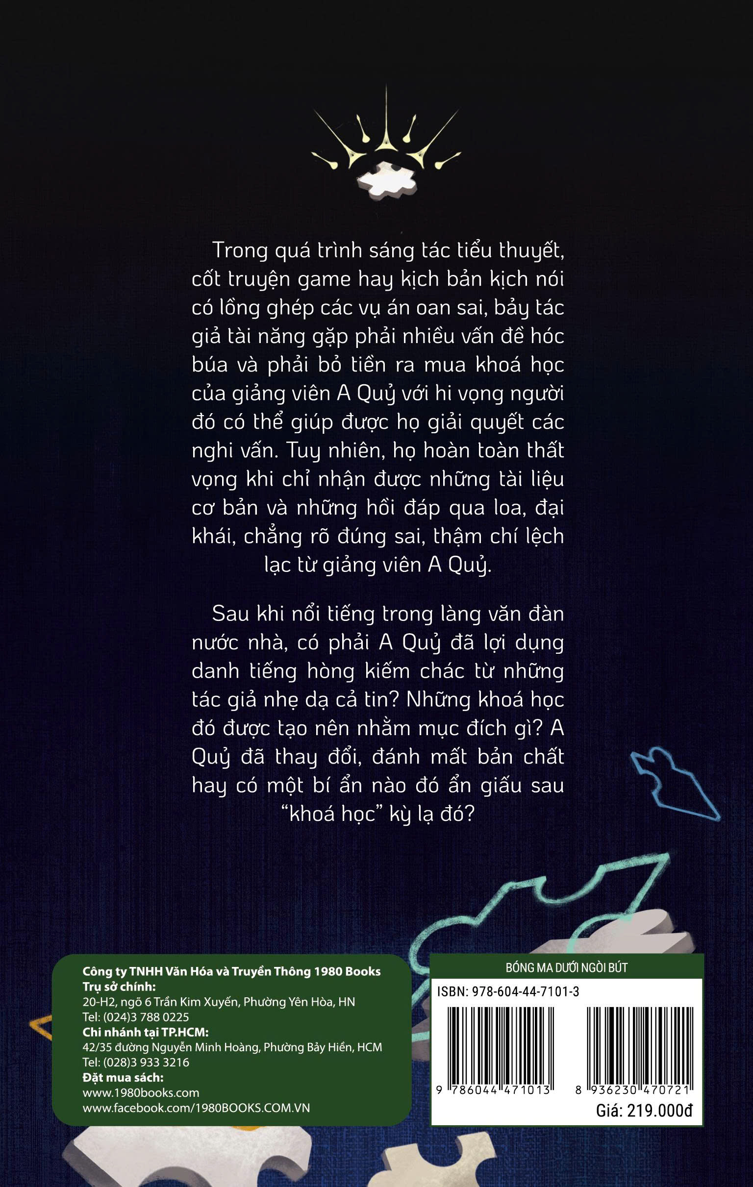 Nội dung chính: MẶT NẠ A QUỶ Làm thế nào để viết những câu chuyện dựa trên các vụ án oan sai có thật? Bảy tác giả, mỗi người chọn một vụ án từng xảy ra tại Đài Loan, ấp ủ mong muốn sáng tác ra một tuyệt phẩm để được độc giả công nhận hay giành các giải thưởng Văn học danh giá. Tuy nhiên, những email đến từ độc giả vô danh, bí ẩn A Quỷ đã phá huỷ hoàn toàn những đứa con tinh thần mà họ cho là hoàn mỹ ấy. A Quỷ thẳng thắn chỉ ra những sai lầm, những lỗ hổng chết người trong cốt truyện khiến “chân tướng” các tác giả xây nên sụp đổ. Vì sao A Quỷ lại có thể đọc được trước các tác phẩm còn chưa được ra mắt? Những lời nhận xét sắc bén trong email có ý đồ gì? Và A Quỷ thực sự là ai khi không ngần ngại đánh giá những tác phẩm của các nhà văn tài năng ấy? BÓNG MA DƯỚI NGÒI BÚT Trong quá trình sáng tác tiểu thuyết, cốt truyện game hay kịch bản kịch nói có lồng ghép các vụ án oan sai, bảy tác giả tài năng gặp phải nhiều vấn đề hóc búa và phải bỏ tiền ra mua khoá học của giảng viên A Quỷ với hi vọng người đó có thể giúp được họ giải quyết các nghi vấn. Tuy nhiên, họ hoàn toàn thất vọng khi chỉ nhận được những tài liệu hướng dẫn cơ bản và những hồi đáp qua loa đại khái, chẳng rõ đúng sai, thậm chí lệch lạc từ giảng viên A Quỷ. Sau khi nổi tiếng trong làng văn đàn nước nhà, có phải A Quỷ đã lợi dụng danh tiếng hòng kiếm chác từ những tác giả nhẹ dạ cả tin? Những khoá học đó được tạo nên nhằm mục đích gì? A Quỷ đã thay đổi, đánh mất bản chất hay có một bí ẩn nào đó ẩn giấu sau “khoá học” kỳ lạ đó? Thông tin về tác phẩm: