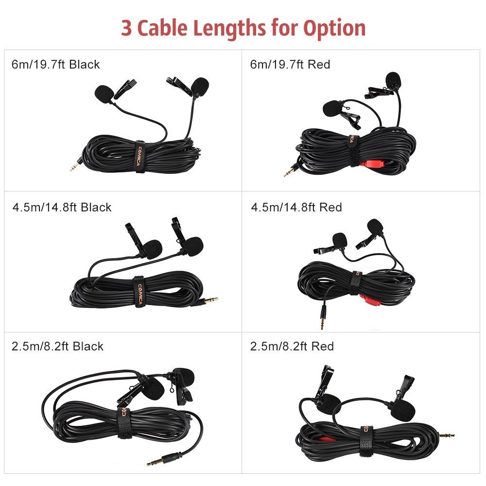 Comica CVM-D02 Omnidirectional Condenser Lavalier Microphone is one Dual-head microphone for audio recording from two different ways of people; The Mic utilizes 2.5mm diameter silica-gel cable, and metal mic-shield materials for production, coming with excellent anti-interference function, and packed in wind muff for broadcast-quality recording !