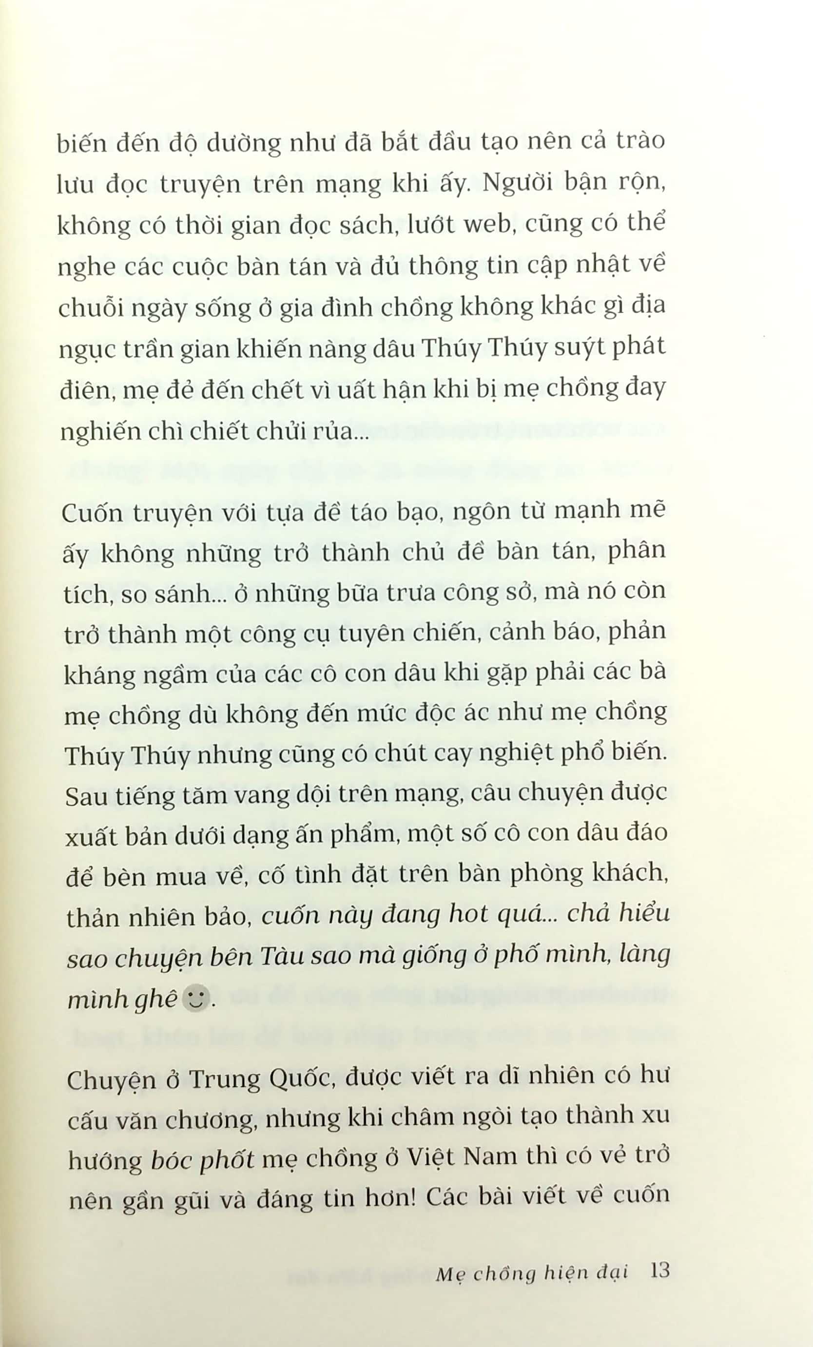 “Cuốn sách này tôi muốn dành tặng tất cả những bà mẹ có con trai và con gái. Có con trai, thì chúng ta sẽ là mẹ chồng, còn nếu có con gái thì con chúng ta cũng có thể sẽ đi làm dâu một bà mẹ chồng nào đó. Làm thế nào để tất cả những phụ nữ khi cùng yêu thương một người đàn ông sẽ vui vẻ hạnh phúc chứ không phải đứng ở hai chiến tuyến mà hét lên “Mẹ hay vợ, anh hãy chọn đi!”. Tại sao chàng trai ấy phải chọn, trong khi hoàn toàn có thể có cả hai trong yêu thương?”