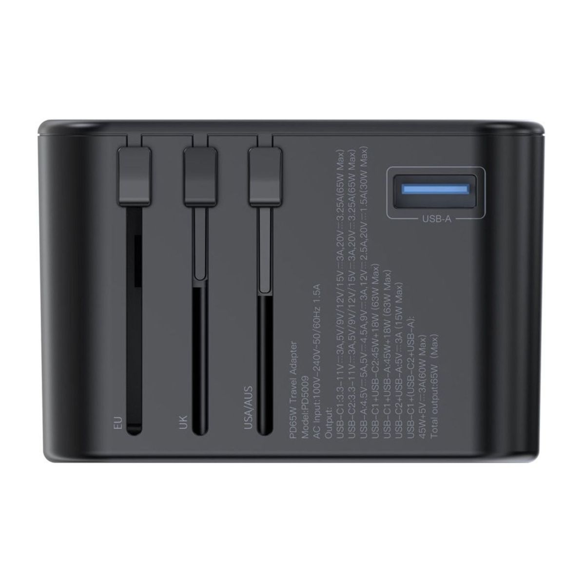 1. Màu đen 2. Đầu vào : 100-240V/0.5A chân cắm tròn chuẩn EU 3. Đầu ra : -USB-C1:5V/3A 9V/3A 12V/3A 15V/3A 20V/3.25A 65W Max - USB-C2:5V/3A 9V/3A 12V/3A 15V/3A 20V/3.25A 65W Max - USB-C3:5V/3A 9V/2A