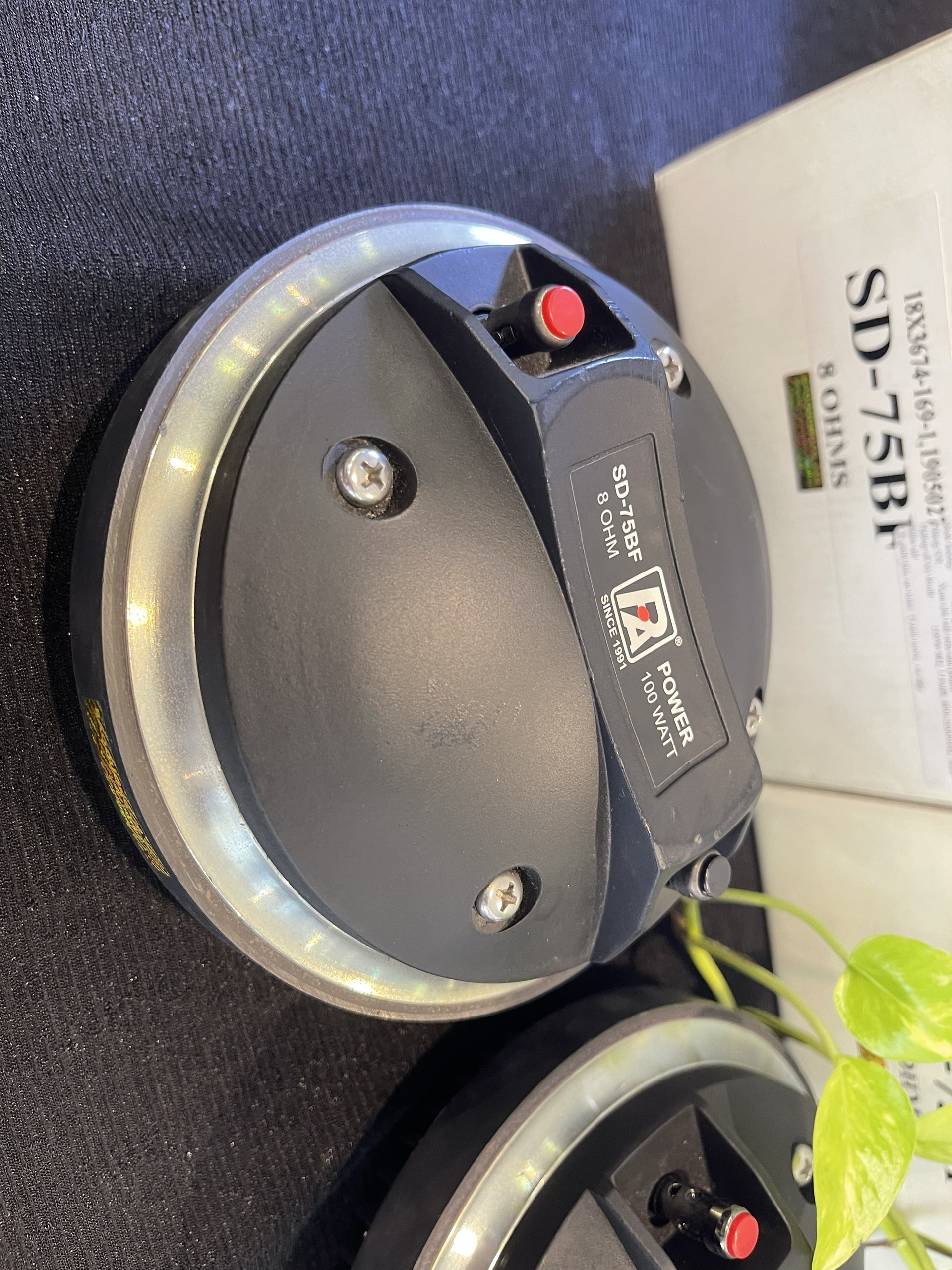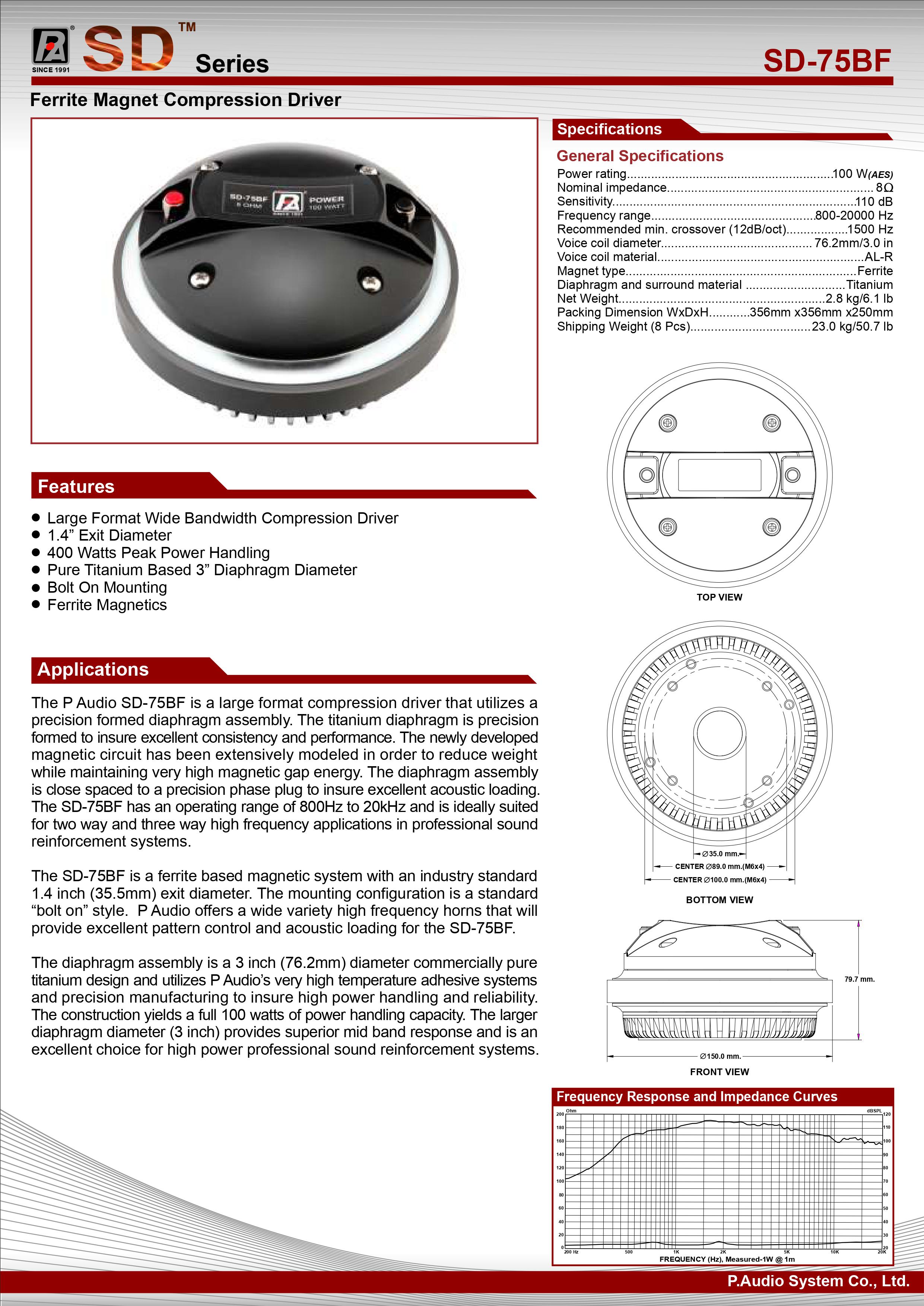 P Audio SD-75BF là trình điều khiển nén định dạng lớn, sử dụng cụm màng hình thành chính xác. Màng loa titan được hình thành chính xác để đảm bảo tính nhất quán và hiệu suất tuyệt vời. Mạch từ mới được phát triển đã được mô hình hóa rộng rãi để giảm trọng lượng trong khi vẫn duy trì năng lượng khoảng cách từ rất cao. Việc lắp ráp màng loa được đặt gần với phích cắm pha chính xác để đảm bảo tải âm tuyệt vời. SD-75BF có dải hoạt động từ 800Hz đến 20kHz và phù hợp lý tưởng cho các ứng dụng tần số cao hai chiều và ba chiều trong các hệ thống tăng cường âm thanh chuyên nghiệp. SD-75BF là một hệ thống từ tính dựa trên ferrite với đường kính thoát 1,4 inch (35,5mm) tiêu chuẩn công nghiệp. Các cấu hình gắn là một bu lông tiêu chuẩn về phong cách. P Audio cung cấp nhiều loại còi tần số cao đa dạng sẽ cung cấp khả năng kiểm soát mẫu và tải âm thanh tuyệt vời cho SD-75BF. Tổ hợp màng có thiết kế titan tinh khiết thương mại có đường kính 3 inch (76,2mm) và sử dụng hệ thống kết dính nhiệt độ rất cao của P Audio và sản xuất chính xác để đảm bảo khả năng xử lý công suất cao và độ tin cậy. Công trình mang lại công suất xử lý công suất 100 watt. Đường kính màng lớn hơn (3 inch) cung cấp đáp ứng dải giữa vượt trội và là lựa chọn tuyệt vời cho các hệ thống tăng cường âm thanh chuyên nghiệp công suất cao.