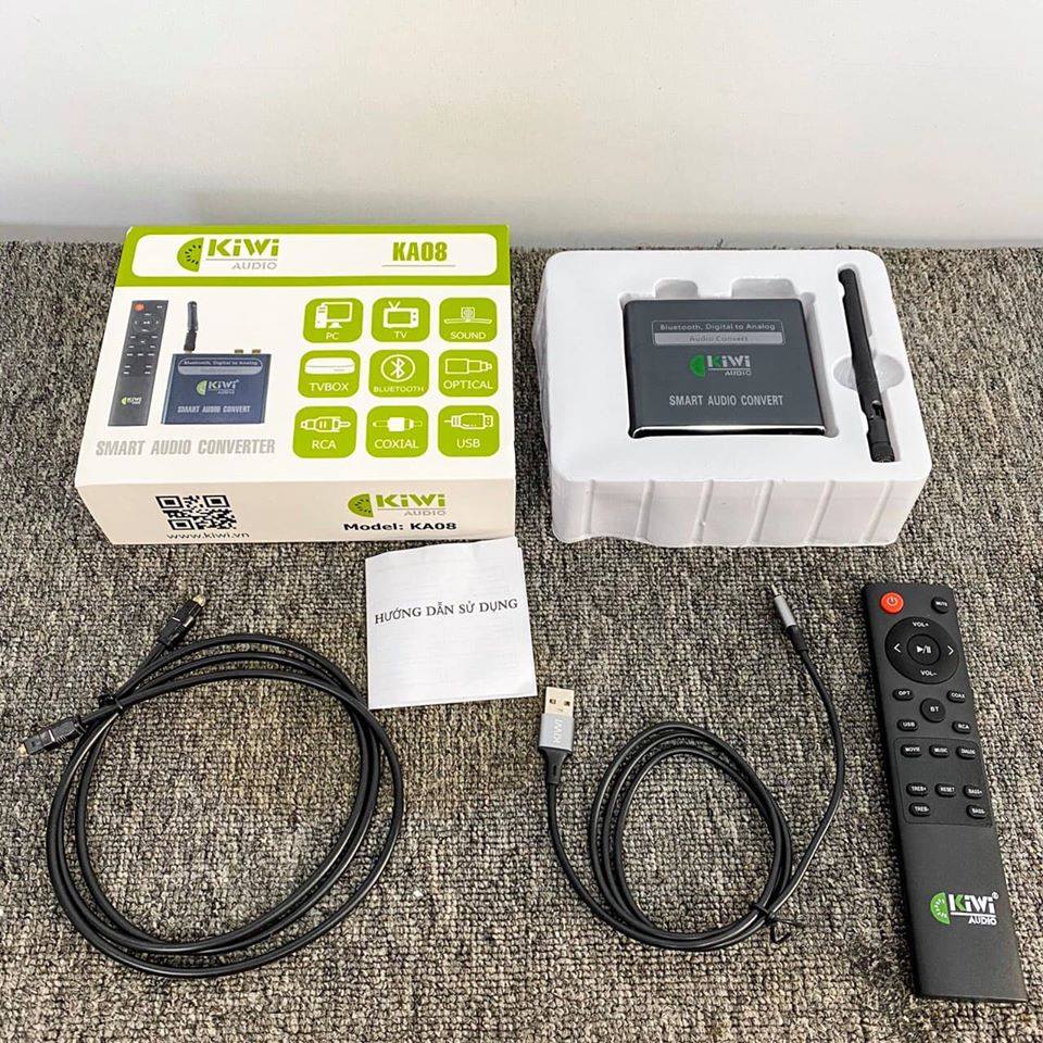 - Bộ giải mã âm thanh – Chuyển quang KA08 (Đầu vào bao gồm các cổng: Quang học -Optical, Đầu jack 3.5mm, Coxial, USB, Bluetooth), đầu ra âm thanh: cổng AV (đầu bông sen trắng, đỏ)
