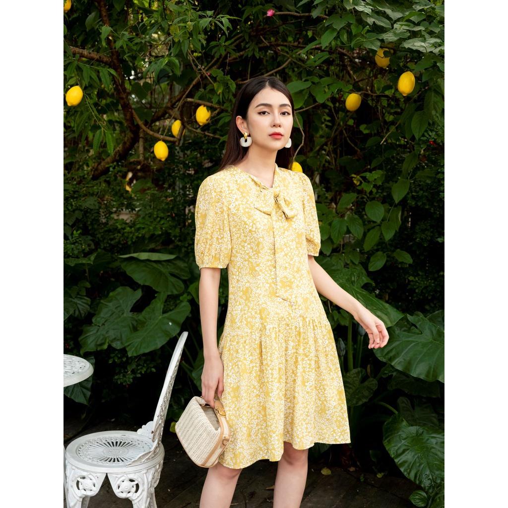 Đầm xẻ trước dáng suông tay phồng ngắn dây cột nơ cổ của T&M