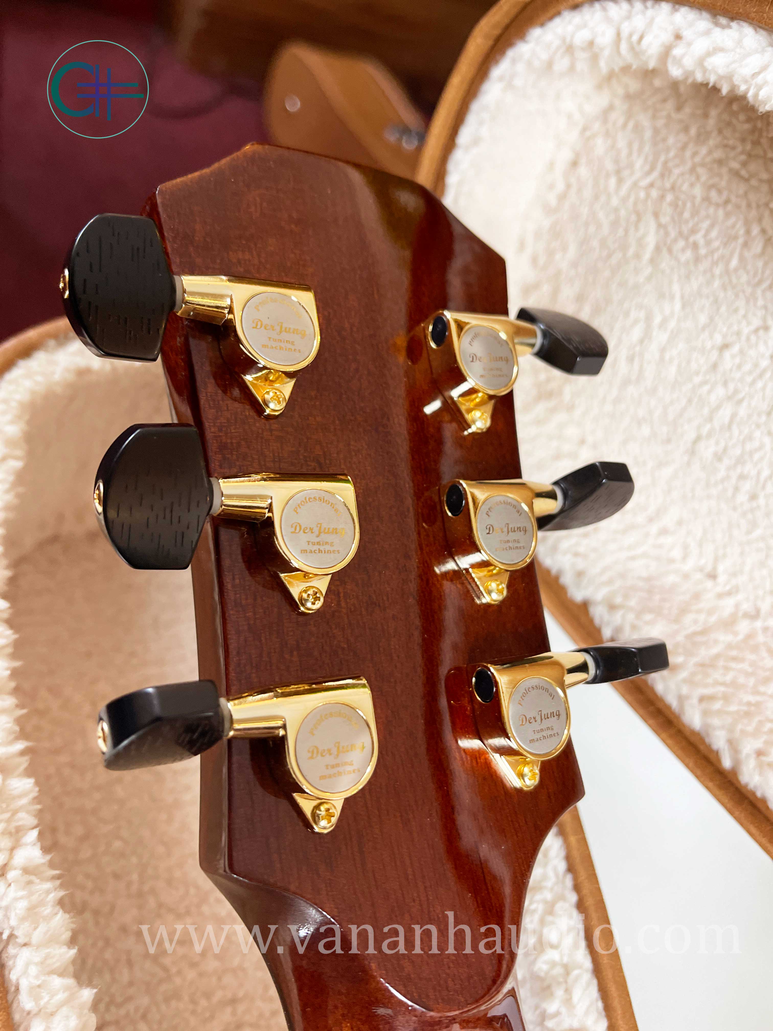 Mặt: Gỗ Thông Sitka Eo + lưng: Gỗ Hồng Đào cao cấp. Cần: Gỗ Giá Tỵ, bọc chỉ tút, có ty chống cong cần. Mặt phím: Gỗ Đen Ngựa: Gỗ Mun Dây: Alice AW432 Khóa
