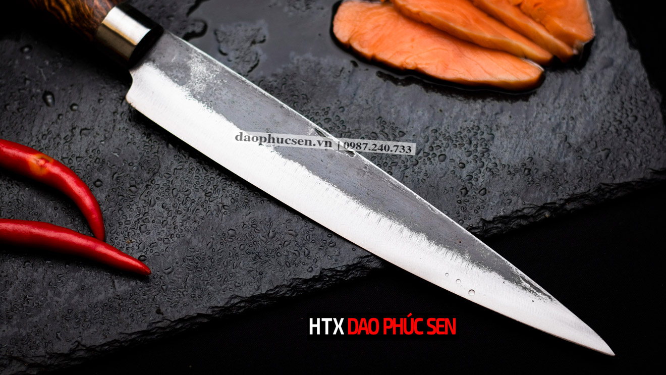 Dao Phúc Sen bản Takohiki - Kích thước: lưỡi: 24cm, cán: 12cm, rộng: 3.5cm, dầy: 2.5 ly, trọng lượng: 200g - Chức năng: sử dụng chuyên thái thịt ,cá, rau củ và các thực phẩm