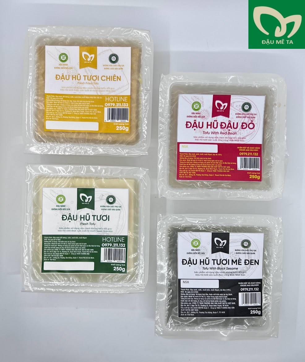 Với sản phẩm tươi sống, trọng lượng thực tế có thể chênh lệch khoảng 10%. ĐẬU HŨ TƯƠI VỊ NGUYÊN BẢN 250g Thành Phần: Đậu nành (đỗ tương), Nước, Muối biển Nigari HSD: 5 ngày kể từ ngày sản xuất Bảo quản: Nhiệt độ mát (2-8 độ C), hoặc trong ngăn mát tủ lạnh Thông tin cảnh bảo: Không sử dụng sản phẩm đã hết HSD hoặc có dấu hiệu hư hỏng. Cảnh báo dị ứng với bất kỳ thành phần nào của sản phẩm CÔNG TY TNHH THƯƠNG MẠI SẢN XUẤT METTA VIỆT NAM Chuyên sản xuất cung cấp ĐẬU HŨ TƯƠI NGUYÊN CHẤT Nguồn đậu nành KHÔNG biến đổi gen Nguồn gốc xuất xứ nguyên liệu rõ ràng, đảm bảo theo tiêu chuẩn quy định Đậu Hũ được làm từ muối Nigari Nhật Bản Chuyên cung cấp cho Nhà Hàng, Quán Ăn, Cafe Nhà xưởng máy móc hiện đại, đáp ứng chuẩn tiêu chuẩn phân khúc nhà hàng, quán ăn