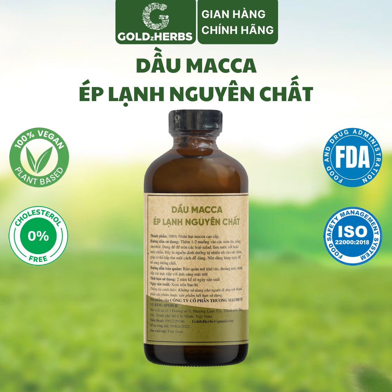 Dầu Macca Ép Lạnh Nguyên Chất Goldzherbs được làm từ 100% Nhân hạt macca cao cấp với công nghệ ép lạnh, giúp giữ tối đa giá trị dinh dưỡng và hương vị thơm tự nhiên