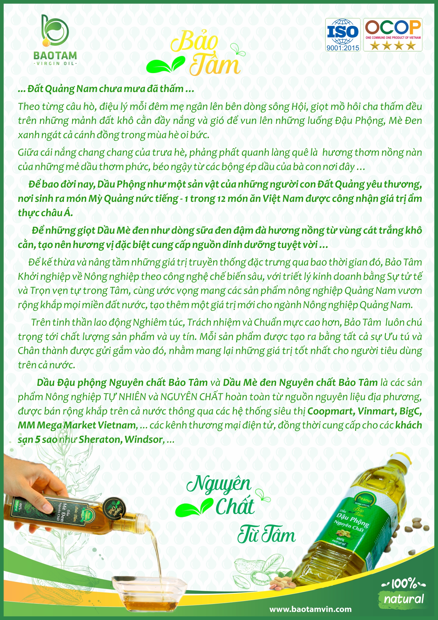 Dầu phộng Nguyên chất Bảo Tâm được sản xuất từ Đậu phộng sẻ, trồng tại vùng đồng bằng đất cát pha thịt ở Tam Kỳ và Thăng Bình của tỉnh Quảng Nam giúp dầu sạch hơn, thơm hơn, ngon hơn, màu vàng đẹp hơn