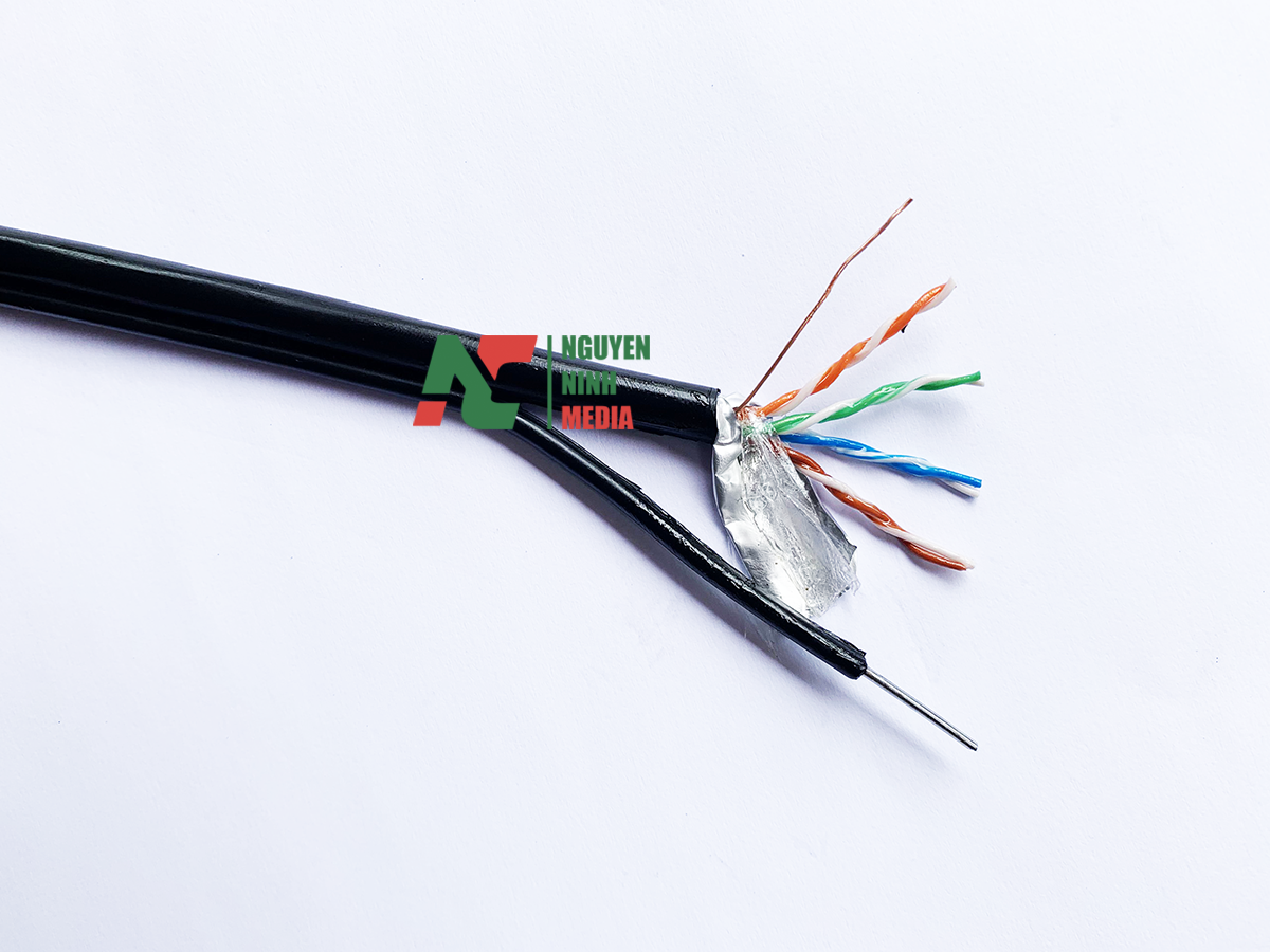 - Ngoài ra, thành phần kết cấu cáp mạng lan ngoài trời FTP còn có thêm 1 sợi dây dù trợ lực ( sợi màu trắng trong ảnh) và 1 sợi dây đồng trần tiếp mát vừa đảm bảo chất lượng, vừa đảm bảo an toàn.