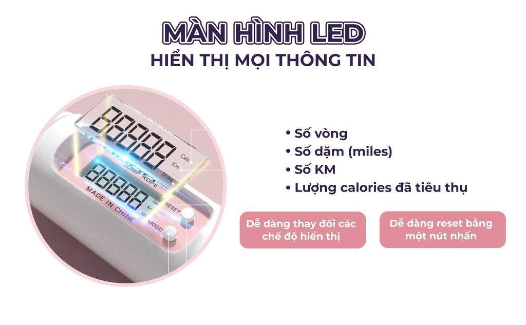 - Đồng hồ LED hiển thị: Số vòng nhảy,calo tiêu thụ,quảng đường (km),số dặm (miles).