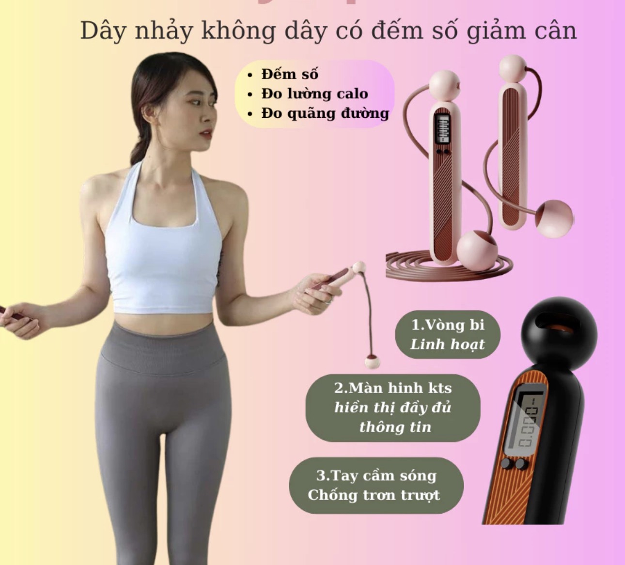 Mua tại TiktokMô Tả Sản Phầm: Dây nhảy không dây thể dục - Dây nhảy dây không dây đếm số giảm cân, dụng cụ thể thao đốt calo tại nhà hiệu quả Cải thiện khả năng phối hợp của cơ chân, giảm nguy cơ chân bị chấn thương. Tăng cường mật độ xương, cho bạn hệ thống xương khớp khỏe mạnh. Cải thiện sức khỏe của hệ tim mạch, phòng chống những bệnh lý liên quan đến tim mạch như đau tim, đột quỵ… Tăng hiệu quả hơi thở, tránh được tình trạng hụt hơi THÔNG TIN SẢN PHẨM