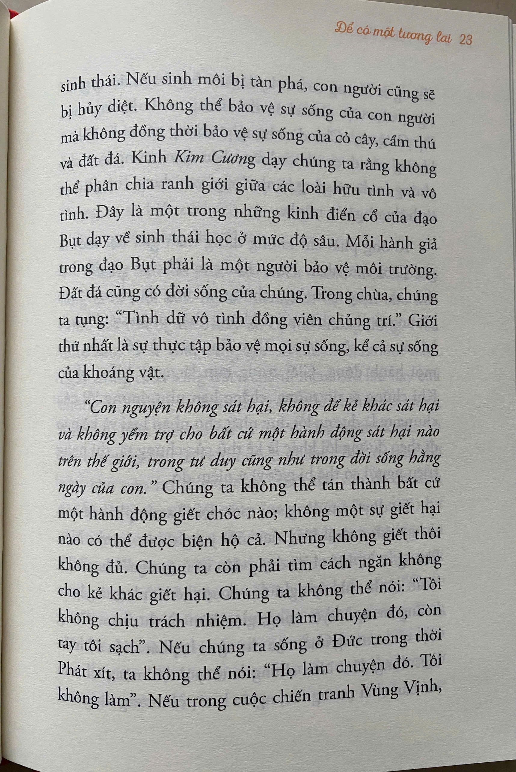 Học hỏi và thực tập theo Năm Giới và nương tựa Tam Bảo chắc chắn sẽ mang lại an lạc cho bản thân, cho cộng đồng và cho xã hội. Là con người, chúng ta cần có một cái gì để tin tưởng, một cái gì lành, đẹp và thật, một cái gì mà ta có thể tiếp xúc. Trong quyển sách này, Năm Giới được diễn bày theo hình thức mới, đó là Bảo vệ sự sống, Hạnh phúc chân thực, Tình thương đích thực, Ái ngữ và Lắng nghe, Nuôi dưỡng và trị liệu.