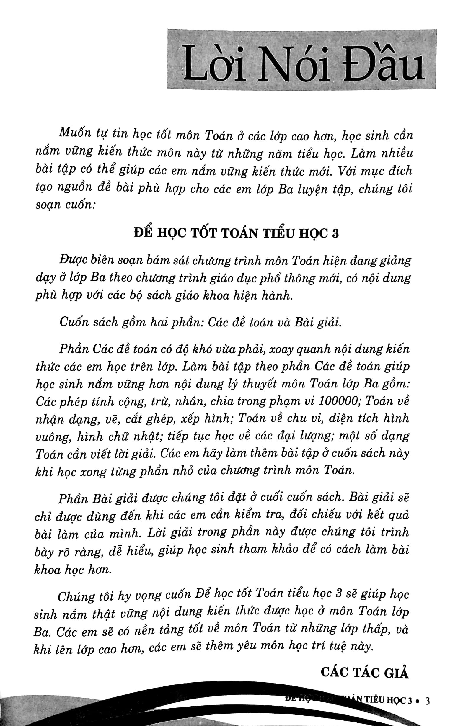 Muốn tự tin học tốt môn Toán ở các lớp cao hơn, học sinh cần nắm vững kiến thức môn này từ những năm tiểu học. Làm nhiều bài tập có thể giúp các em nắm vững kiến thức mới. Với mục đích tạo nguồn đề bài phù hợp cho các em lớp Ba luyện tập, chúng tôi soạn cuốn: