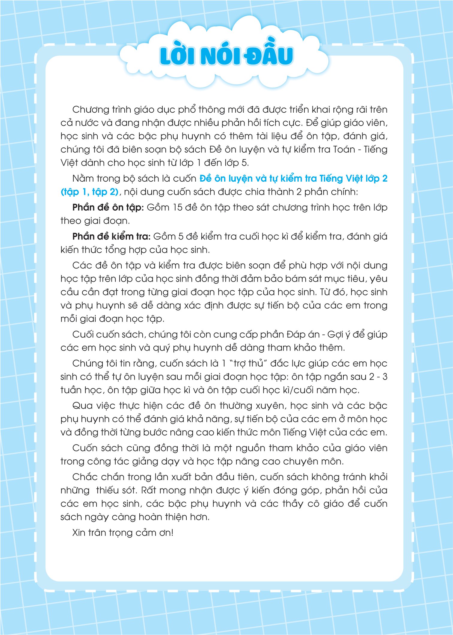 Bộ sách Đề ôn luyện và tự kiểm tra Toán và Tiếng việt là một "trợ thủ" đắc lực giúp các em học sinh có thể tự ôn luyện sau mỗi giai đoạn học tập: ôn tập ngắn sau 2-3 tuần học, ôn tập giữa học kỳ và ôn tập cuối học kỳ - cuối năm học.