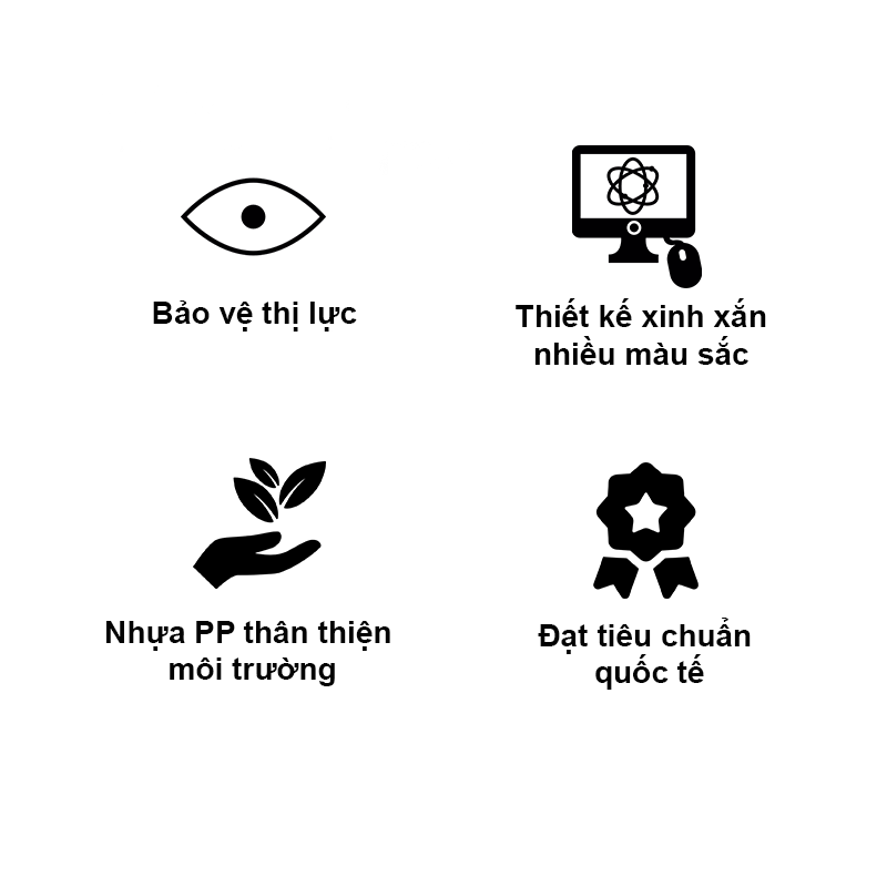 Đèn cắm điện trực tiếp, điện áp: 220V/50Hz Màu ánh sáng: Trắng/ Vàng Độ rọi trên mặt bàn: > 700 lux Ánh sáng liên tục không nhấp nháy, không gây mỏi mắt bảo vệ thị