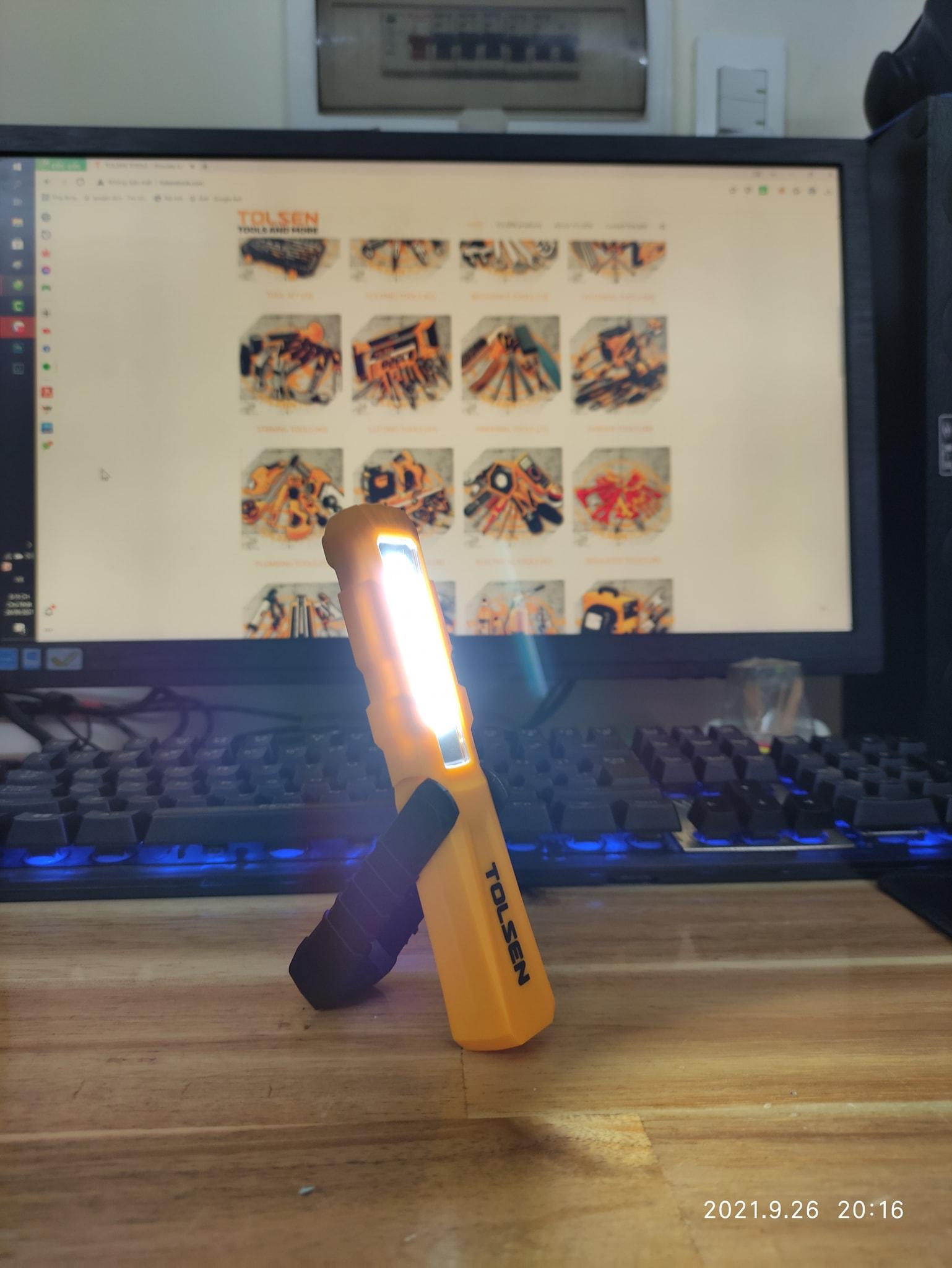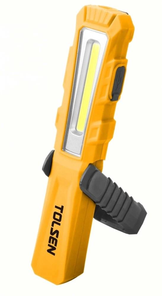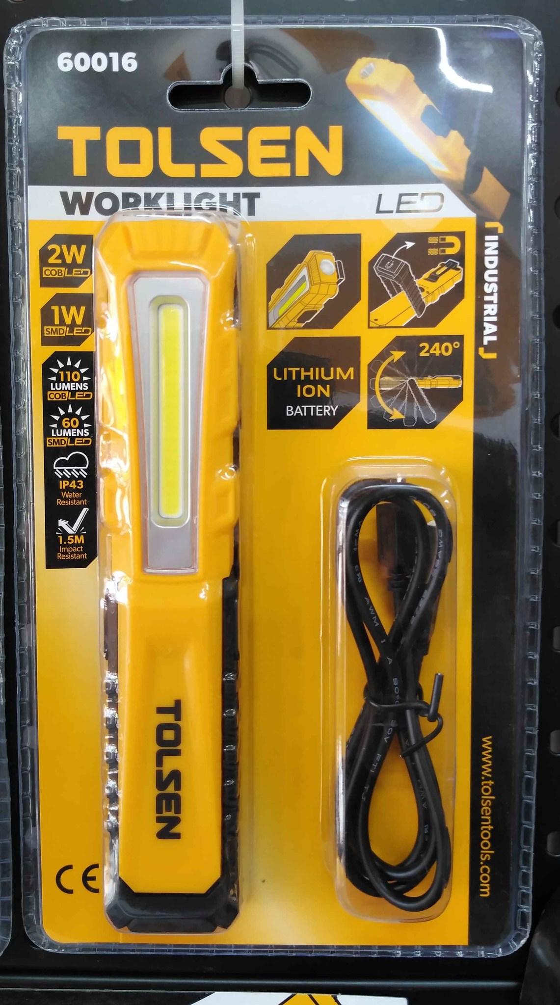 Thương hiệu Tolsen chuyên thiết kế, sản xuất, lắp ráp, cung cấp các thiết bị và dụng cụ công nghiệp dân dụng cỡ lớn và các loại dụng cụ cầm tay đa năng chuyên nghiệp nổi tiếng về chất lượng và hậu mãi tuyệt vời. Các công cụ TOLSEN tập trung vào việc chế tạo các dụng cụ cầm tay chất lượng chuyên nghiệp và các sản phẩm phần cứng liên quan. Tất cả các sản phẩm của TOLSEN đều được kiểm soát chặt chẽ ở mọi bước trong quá trình thiết kế, sản xuất, đóng gói và kiểm soát chất lượng. Các công cụ TOLSEN tin rằng các công cụ chất lượng đề cập đến khả năng sử dụng, hiệu quả và hiệu suất Tolsen có phạm vi sản phẩm khá rộng rãi với trên 2000 sản phẩm bao gồm đủ dụng cụ cầm tay, dụng cụ cơ khí, dụng cụ buộc chặt, dụng cụ cắt, dụng cụ đo, dụng cụ vẽ, vật phẩm PPE, phụ kiện dụng cụ điện, túi và dụng cụ cách điện,   Thông số kĩ thuật -Mã sản phẩm: 60016 -Thương hiệu: TOLSEN -Xuất xứ: Trung Quốc -Kích thước: 152mm x 21mm x 30mm -Vật liệu ABS chống trượt cường độ cao -Mặt trước LED 2W -Mặt trên đèn LED 1W -Pin li-on 3.7V 750mAH -Thời gian làm việc : 2 giờ ở chế độ cao COB; 6,5 giờ ở chế độ thấp COB; 3,5 giờ trong chế độ SMD -Thời gian từ thiện: 2 giờ -Với cáp sạc USB -Chức năng: sáng thấp - sáng cao - đèn trên -Độ sáng tối đa 110Lumen chế độ cao -Độ sáng 80Lumen chế độ thấp -Độ sáng 60lumen chế độ đèn trên.