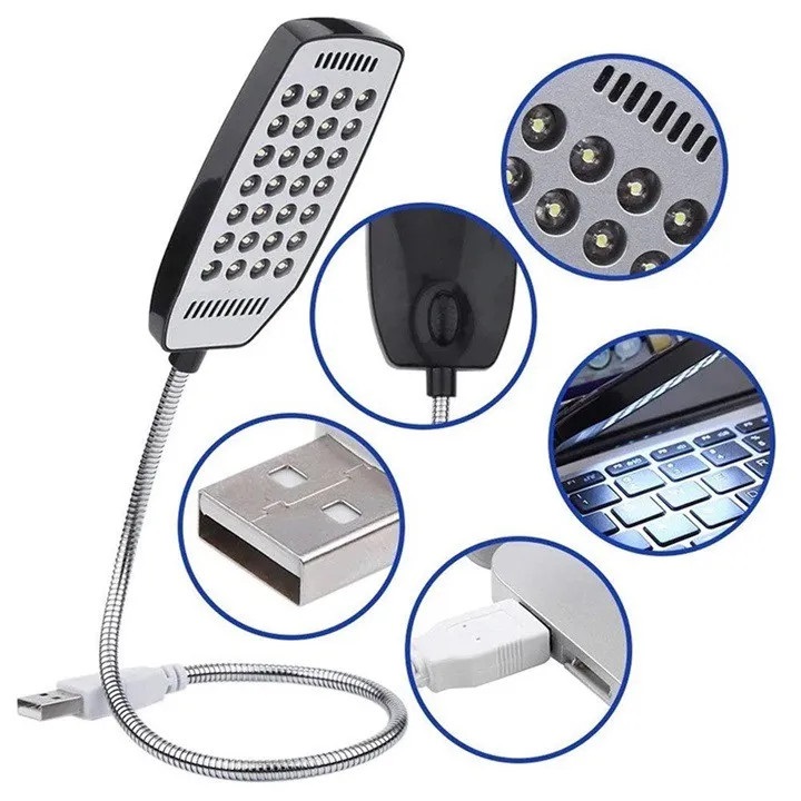 - Thiết kế 28 bóng siêu sáng Thông tin kỹ thuật: Kích thước đèn: 9x4 cm Chiều dài thân đèn: 27 cm Số led: 28 bóng Nguồn USB 5V TÍNH NĂNG: – Thích hợp cho máy tính xách tay, pin sạc dự phòng, cục sạc điện thoại hoặc bất cứ thiết bị gì có cổng USB – Giao diện USB, không cần trình điều khiển. Cắm là chạy. – Đèn LED sáng tiết kiệm điện, tiêu thụ điện năng dưới 40mA, tuổi thọ lâu dài, tuổi thọ có thể đạt hơn 100.000 giờ – Thân ống kim loại dẻo có thể xoay theo mọi hướng, uốn cong tùy ý và điều chỉnh góc độ mà không cần đến các phương pháp cố định như kẹp, buộc… rất linh hoạt và tiện lợi! – Kích thước nhỏ, trọng lượng nhẹ, dễ dàng mang theo, rất dễ dàng để trong cặp hoặc túi xách. – Có công tắc tắt bật